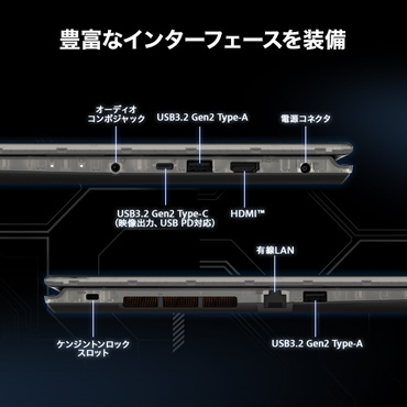 有線LAN ×1(1Gbps) USB3.2 Gen2 Type-C(映像出力、USB PD**対応)×1 ※Thunderbolt非対応 USB3.2 Gen2 Type-A ×2 HDMI ×1 オーディオコンボジャック ×1