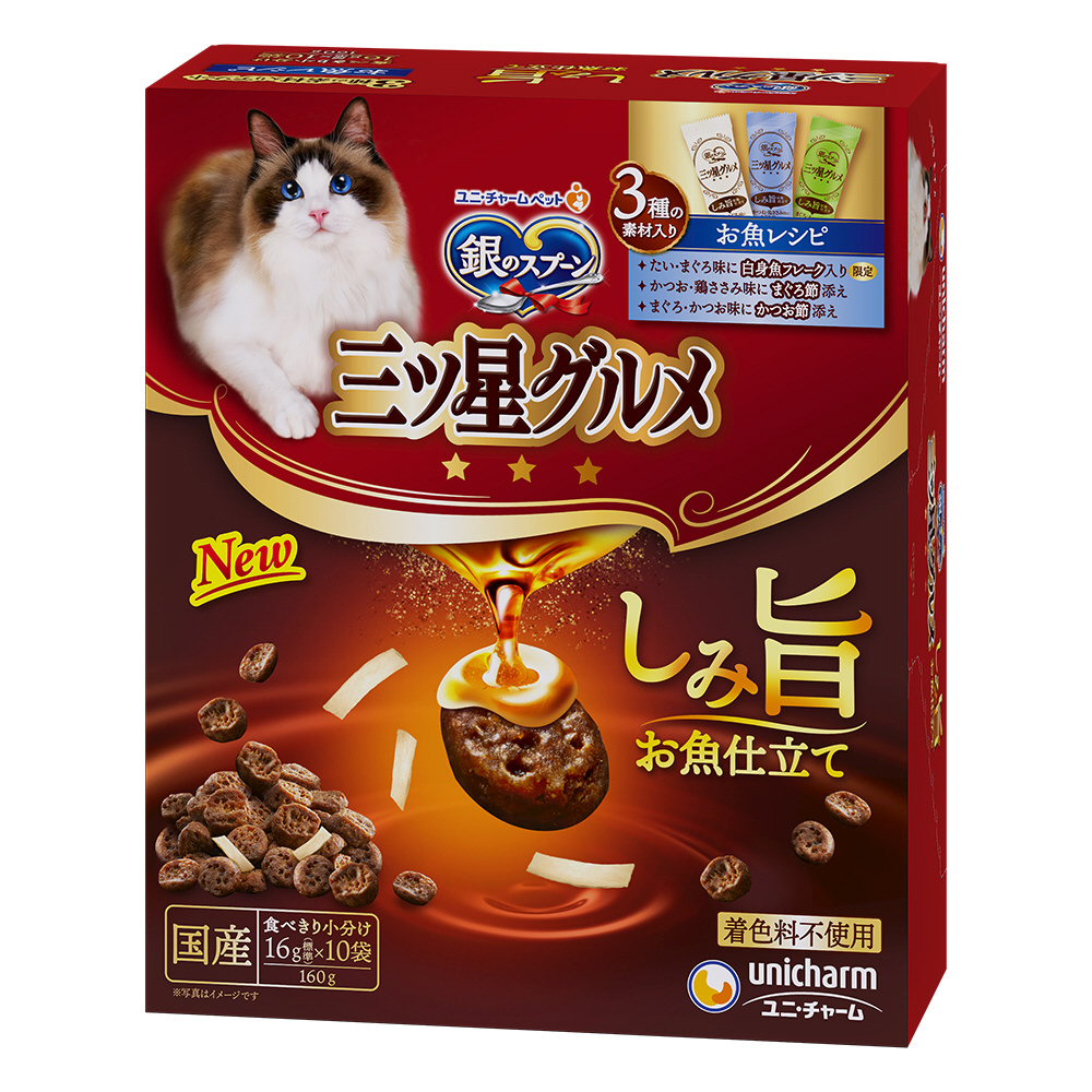 ・お魚の旨みをふんだんにしみこませたドライ粒と猫ちゃんが大好きな3種の素材を入れ、お魚の深い味わいと香りの良さを実現した猫ちゃん喜ぶフードです。