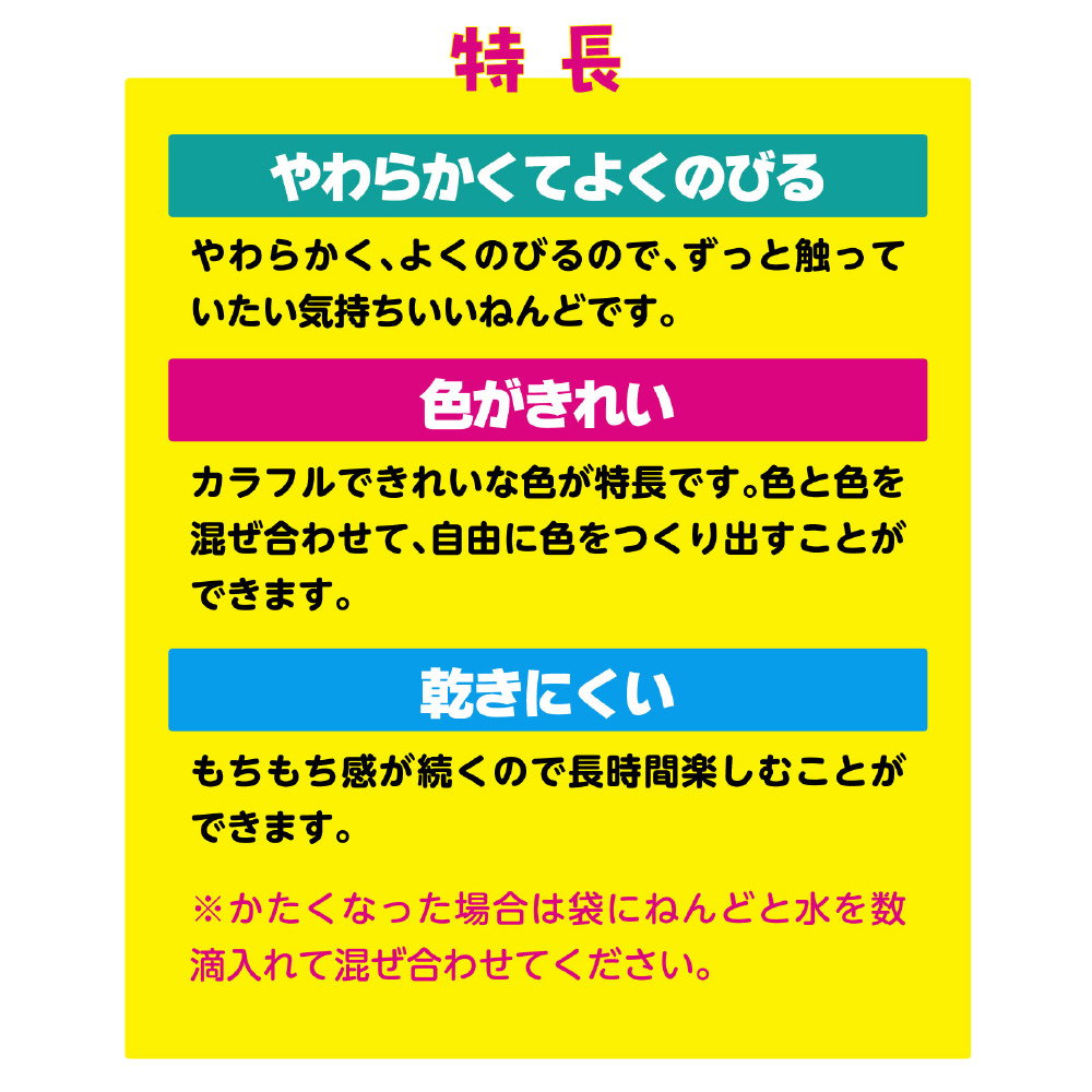 やわらかく、よくのびるのでずっと触っていたい気持ちのいいねんどです。