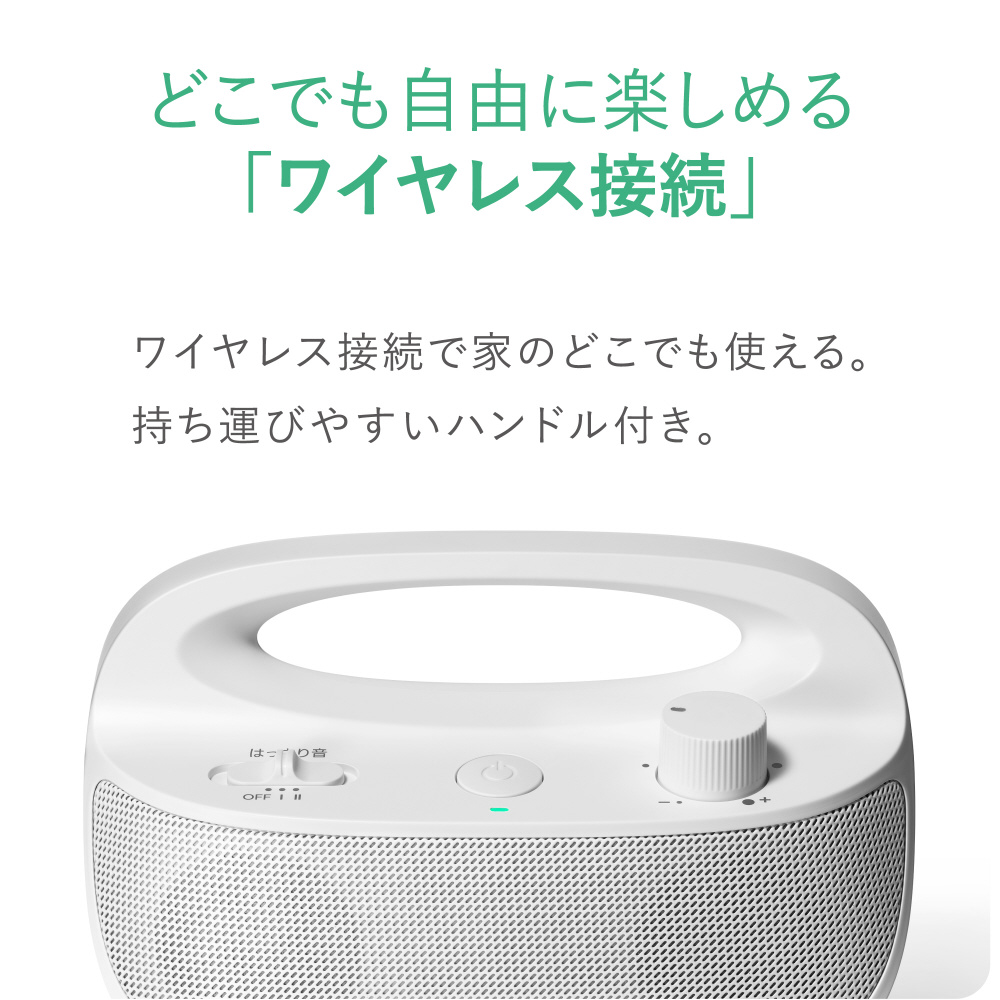 スピーカーの操作は、電源ボタン/ボリュームノブ/はっきり音スイッチとシンプルな設計。電源を「入れる」、音量を「調整する」、はっきり音を「設定する」の3ステップで、迷うことなく直感的に使えます。