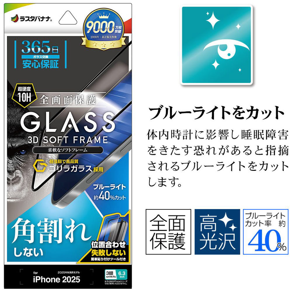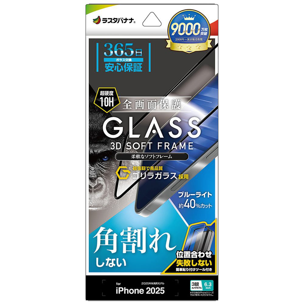 iPhone 17 Pro(6.3インチ)フィルム ソフトフレーム ゴリラガラス ブルーライトカット 治具付 SGE4940IP5B