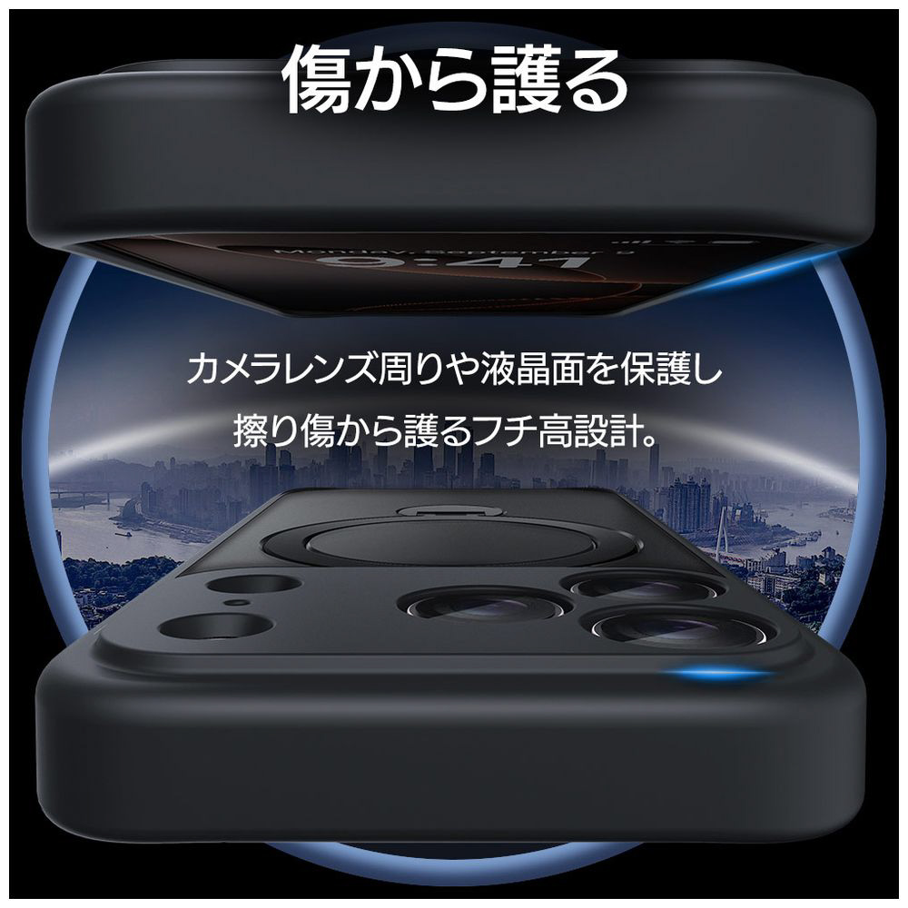 ●指が通せて操作安心、360度回転でお好みの角度に調整可能な、MagSafe対応リング付き。使用しない時はスリムに収まります。※背面のリングを使用する際は必ず端末とケースを一緒に手に持ってください。リングのみを持って宙づりにしたり、振り回す等の行為はしないでください。端末の落下や本製品の破損の原因となります。