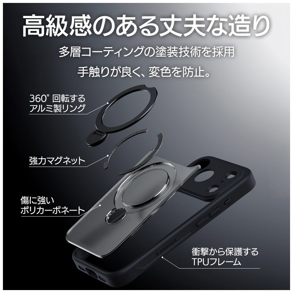 本製品はMagSafeアクセサリをケースの上から固定できる、落下防止やスタンドにもなるリングが付いた、ハイブリッドケースです。