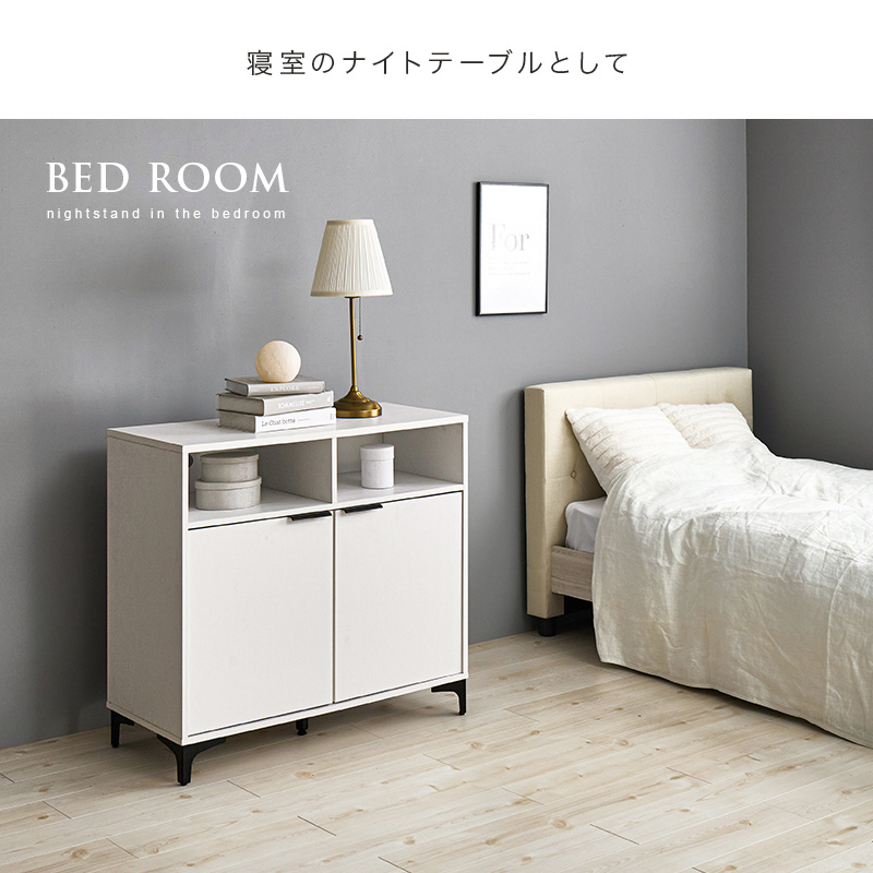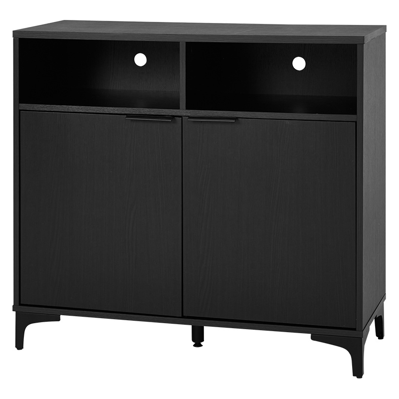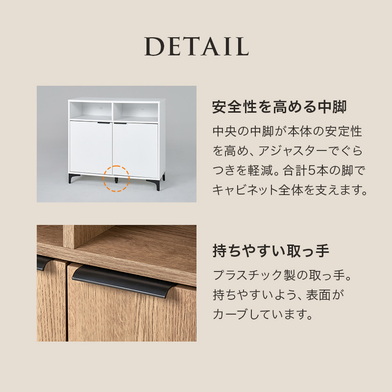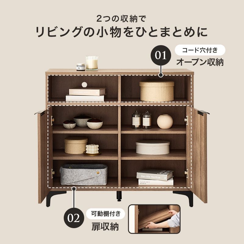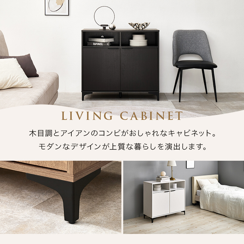 木目調の本体とアイアンの脚部のコンビがおしゃれなキャビネット(幅90cm)。すぐに取りたいものを置けるオープン部と生活感をスッキリ隠せる扉収納が魅力的。