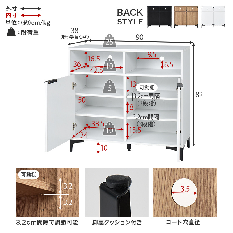生活感を隠す扉収納内の棚板は3.2cm間隔で高さ調節可能。