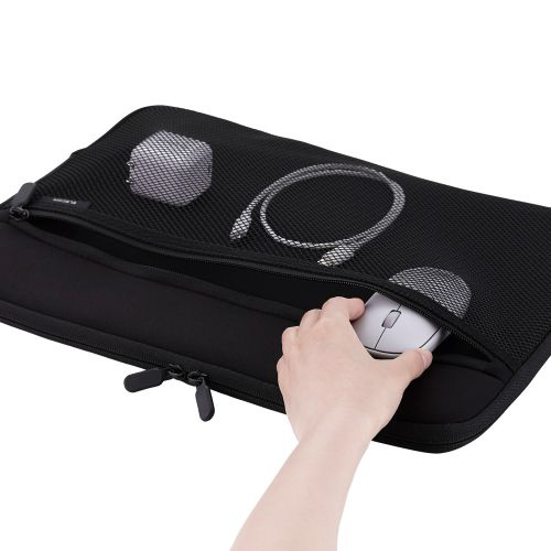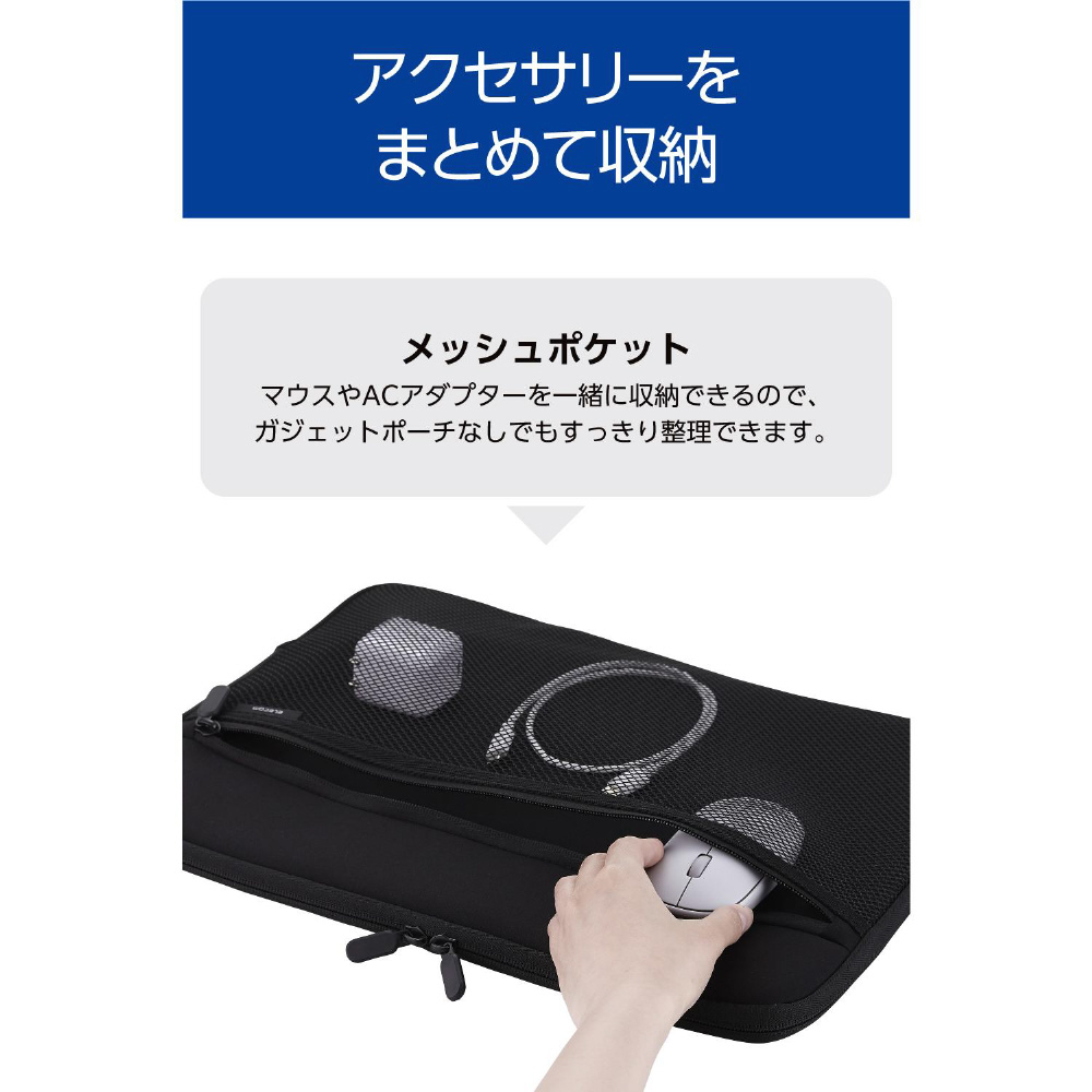 マウスやACアダプターを一緒に収納できるメッシュポケット付き。ガジェットポーチなしでもすっきり整理できます。