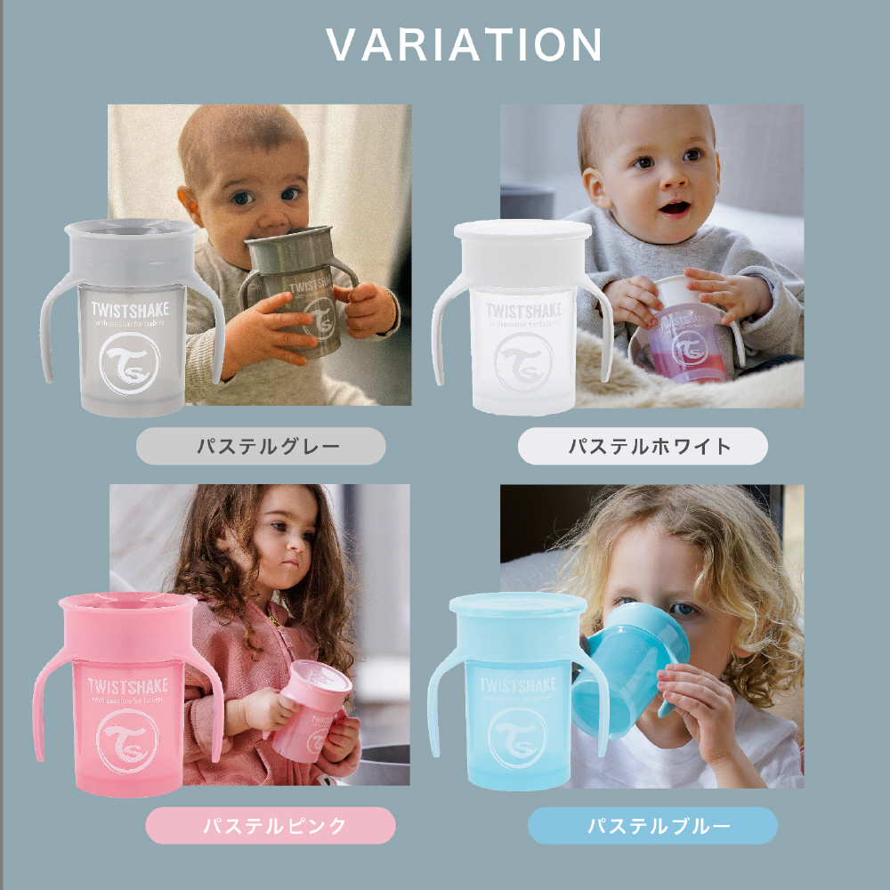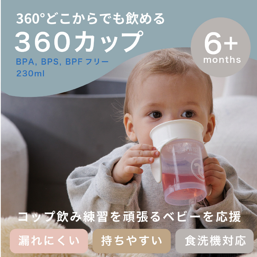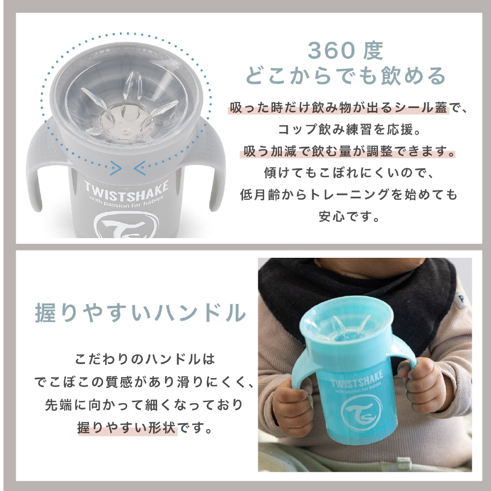 吸った時だけ飲み物が出るシール蓋で、コップ飲み練習を応援。吸う加減で飲む量が調整できます。傾けてもこぼれにくいので、低月齢からトレーニングを始めても安心です。