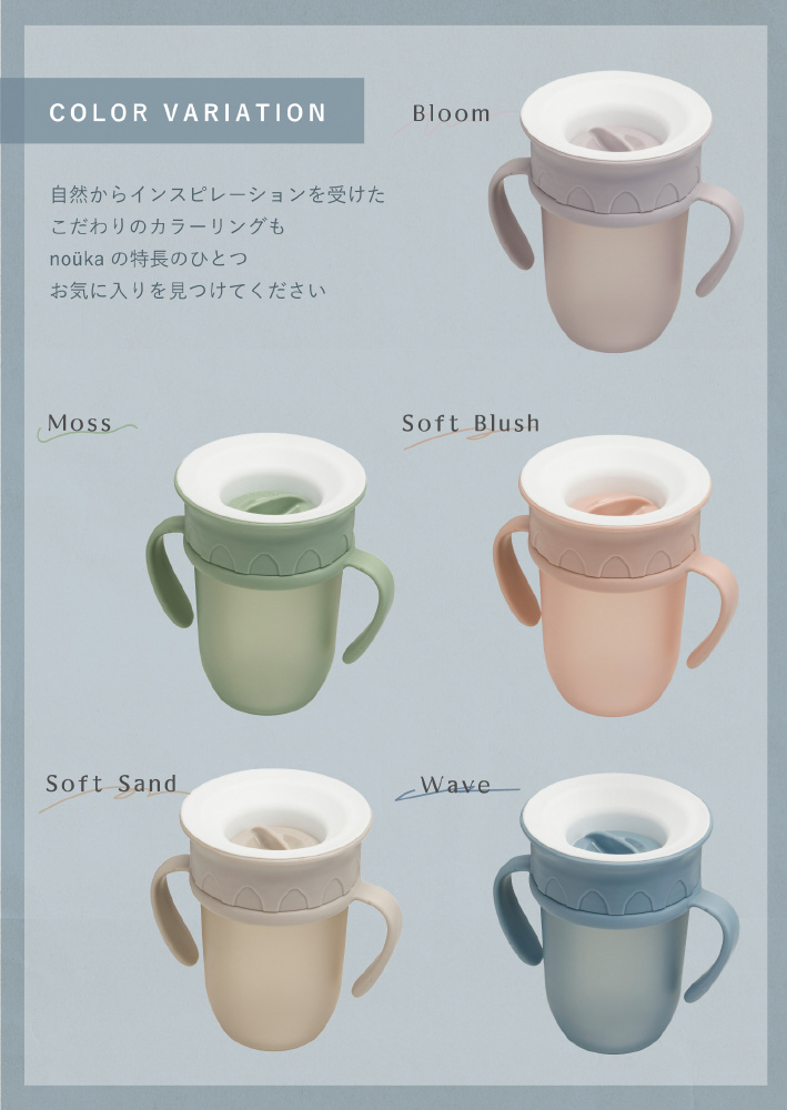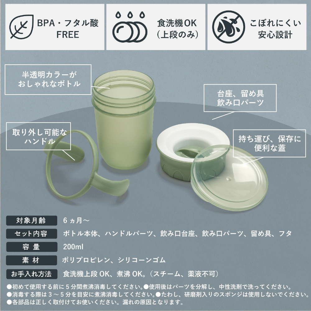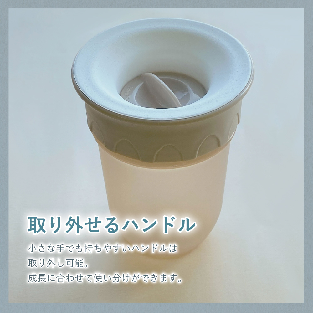 特殊なフタ構造により、どの位置からでも飲みやすい設計になっていて、小さな手でも持ちやすいハンドル付き。取り外しできるので、成長に合わせて使い分けができます。