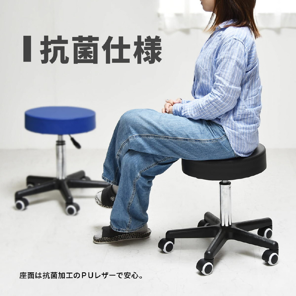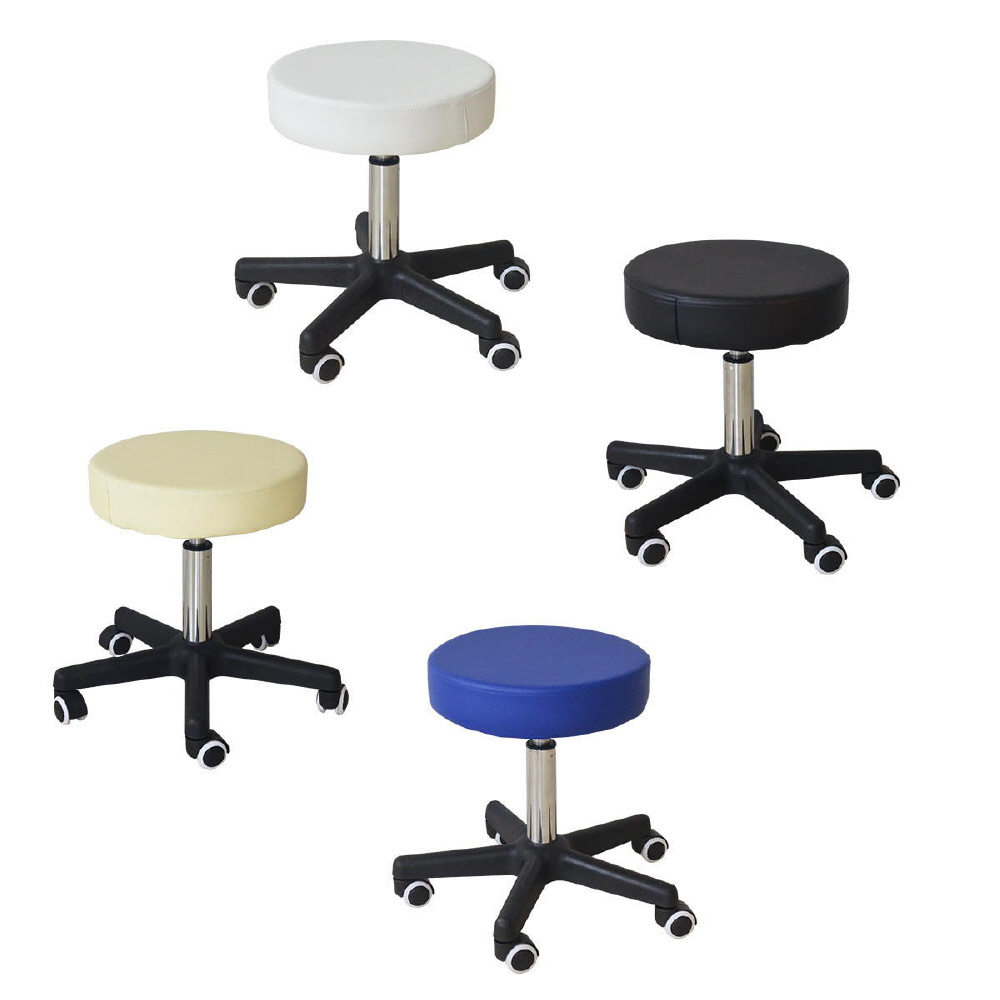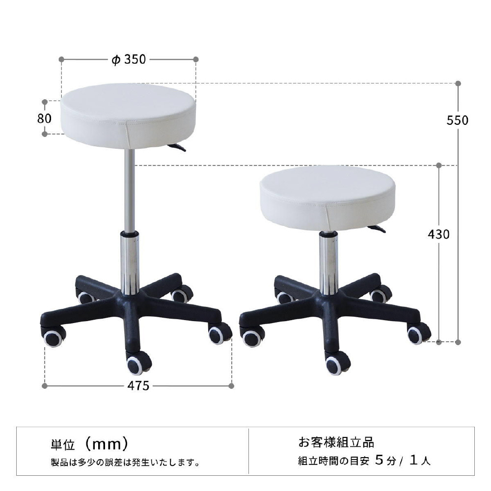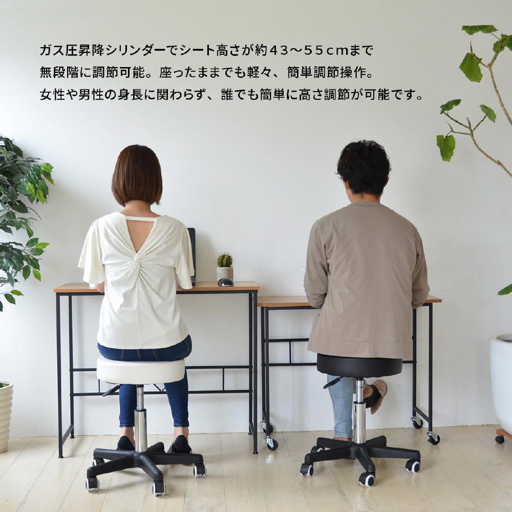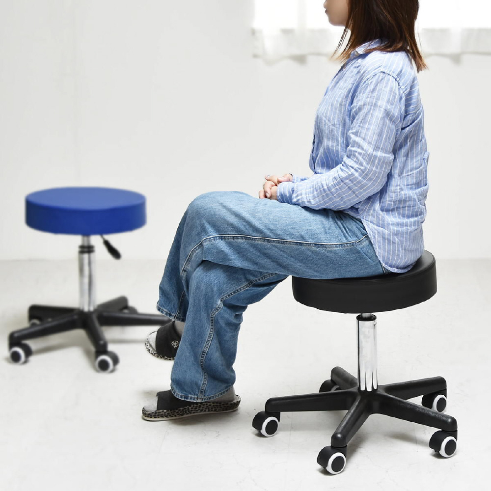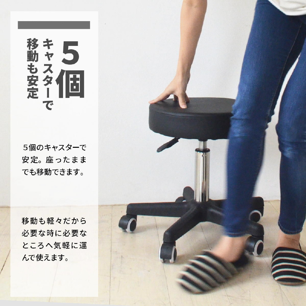 昇降レバーで簡単調節。ガス圧昇降スツールです。座り心地抜群で、背もたれが無いのに長時間座っても疲れない。360度回転するキャスターが付いているので、前後左右、移動も楽々。組立は超簡単なはめ込み式です。カラーは選べる5色、コンパクトなので持ち運びも楽々、家でも、オフィスでも、サロンでも、シーン問わず、活躍させることができます。