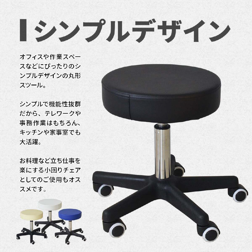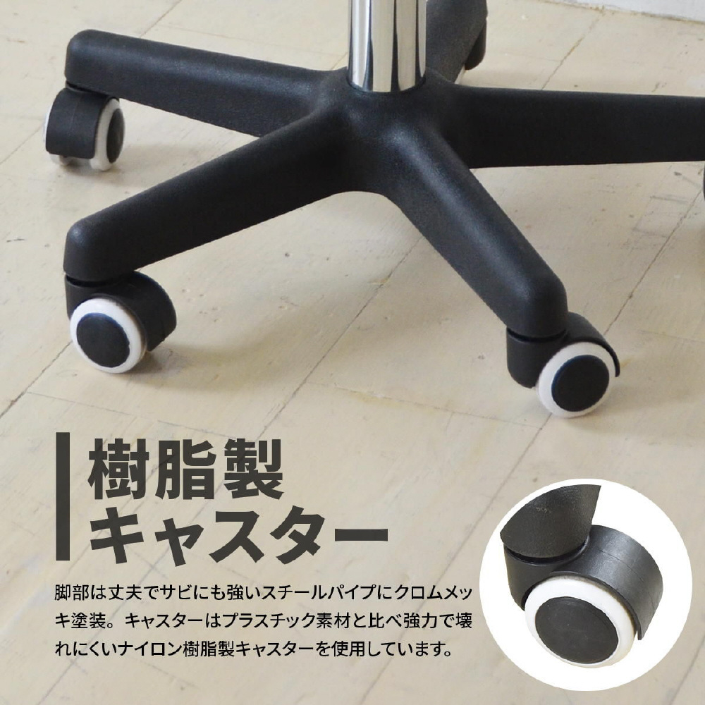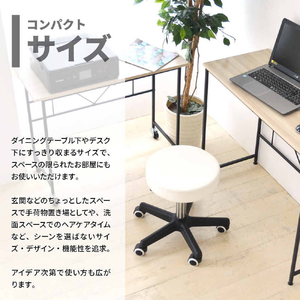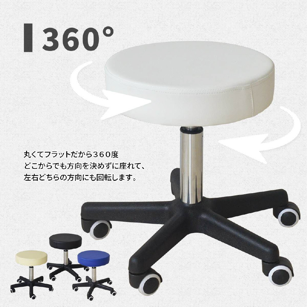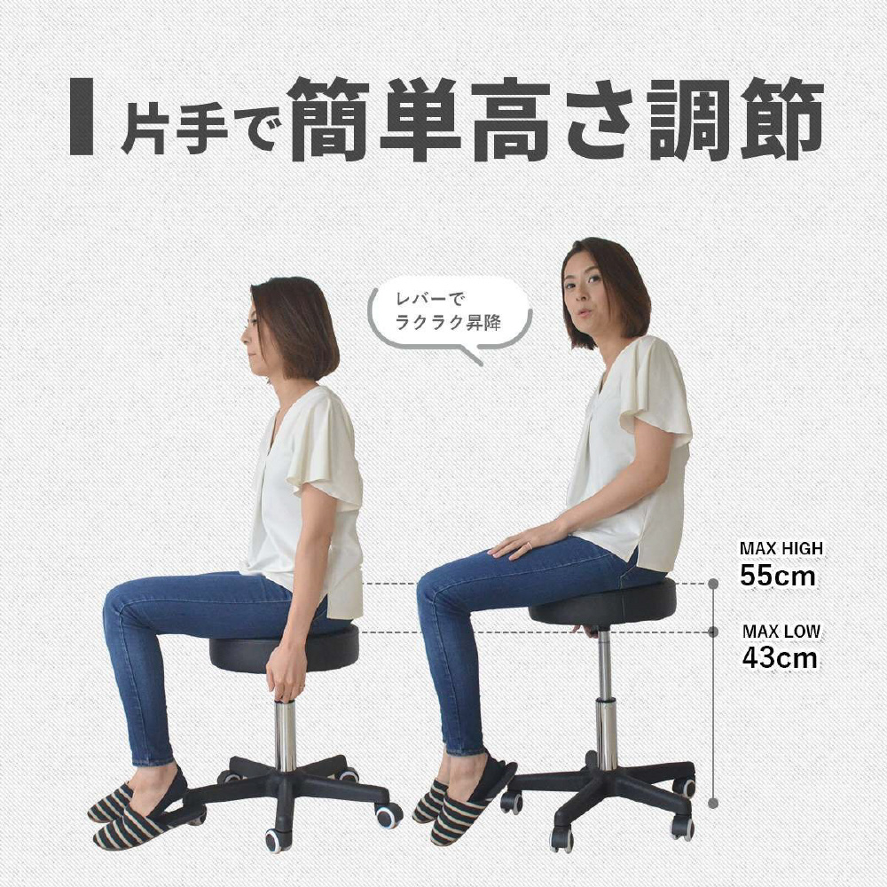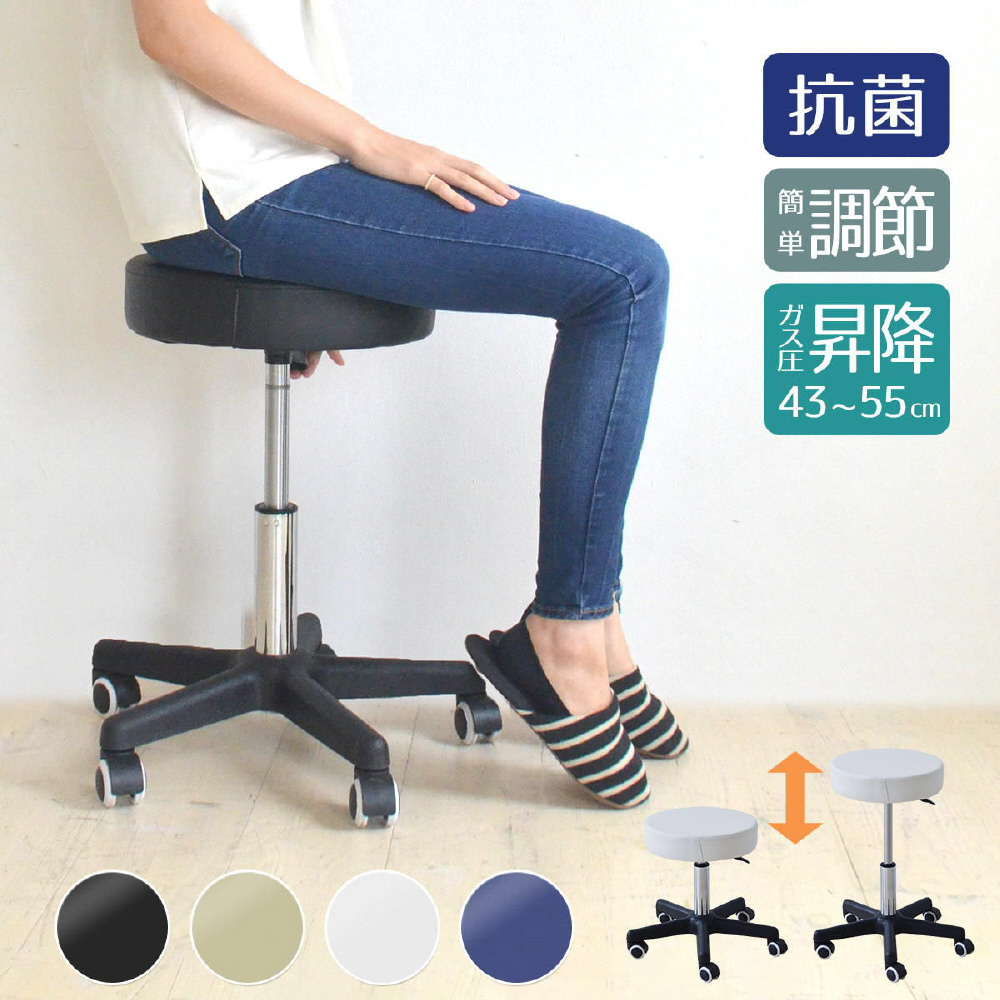昇降レバーで簡単調節。ガス圧昇降スツールです。座り心地抜群で、背もたれが無いのに長時間座っても疲れない。360度回転するキャスターが付いているので、前後左右、移動も楽々。組立は超簡単なはめ込み式です。カラーは選べる5色、コンパクトなので持ち運びも楽々、家でも、オフィスでも、サロンでも、シーン問わず、活躍させることができます。