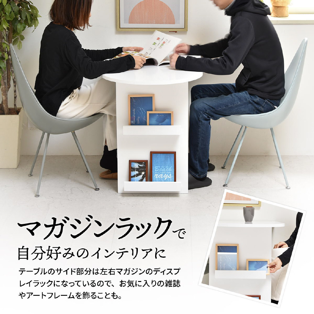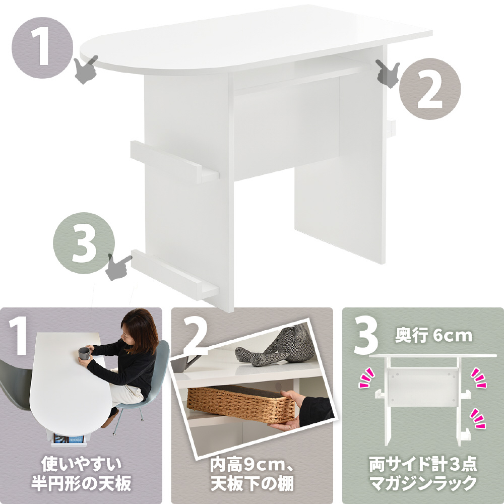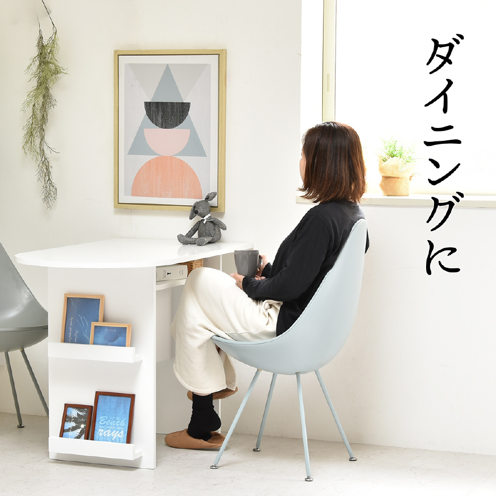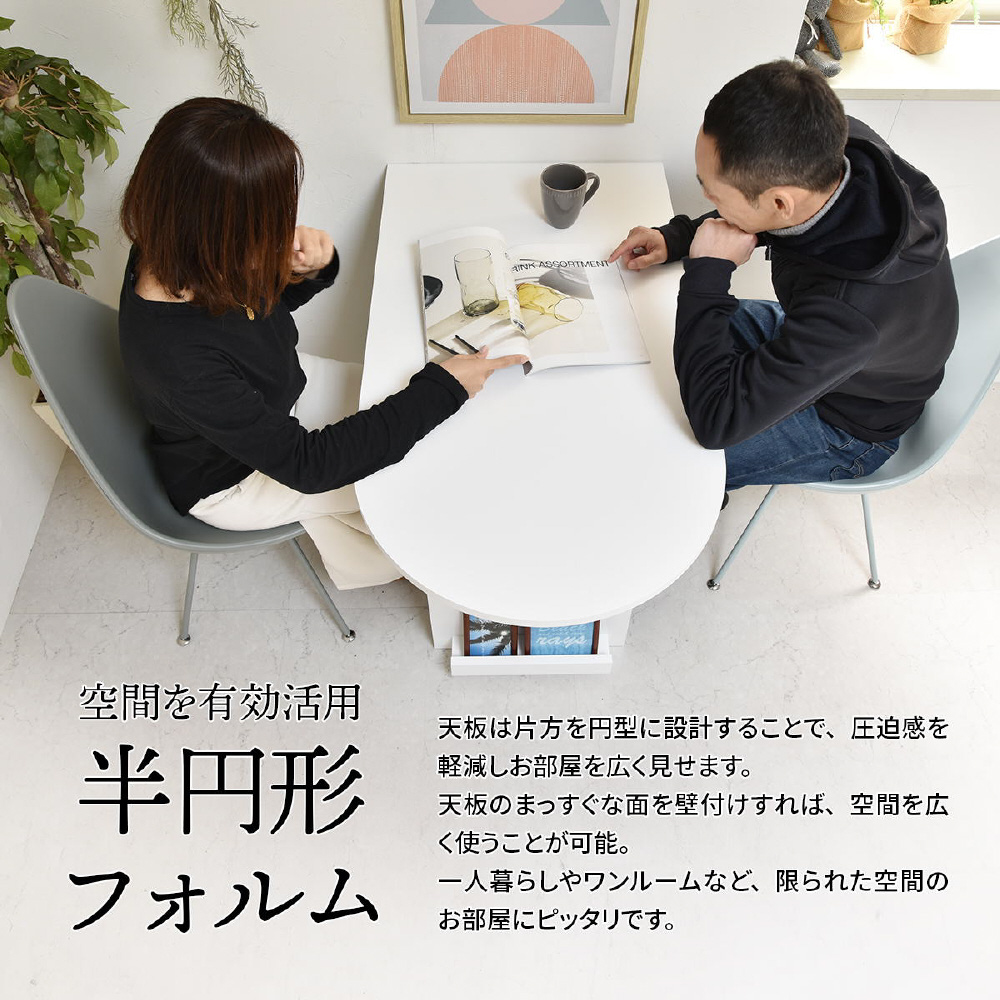 真っ白の天板で、しっかりとした造りとコンパクトなデザインの半円ダイニングテーブル。丸みを帯びたデザインがお部屋をスッキリと見立ててくれます。また左右の側板には、雑誌やケーブルタップを収納できる棚が付いていますので、見える棚には雑誌、見えない奥の棚にはタップコードなど収納できます。窓辺に向けて置いたり、キッチンカウンターと合わせて置くと、ちょっとしたカフェスペースに変身!