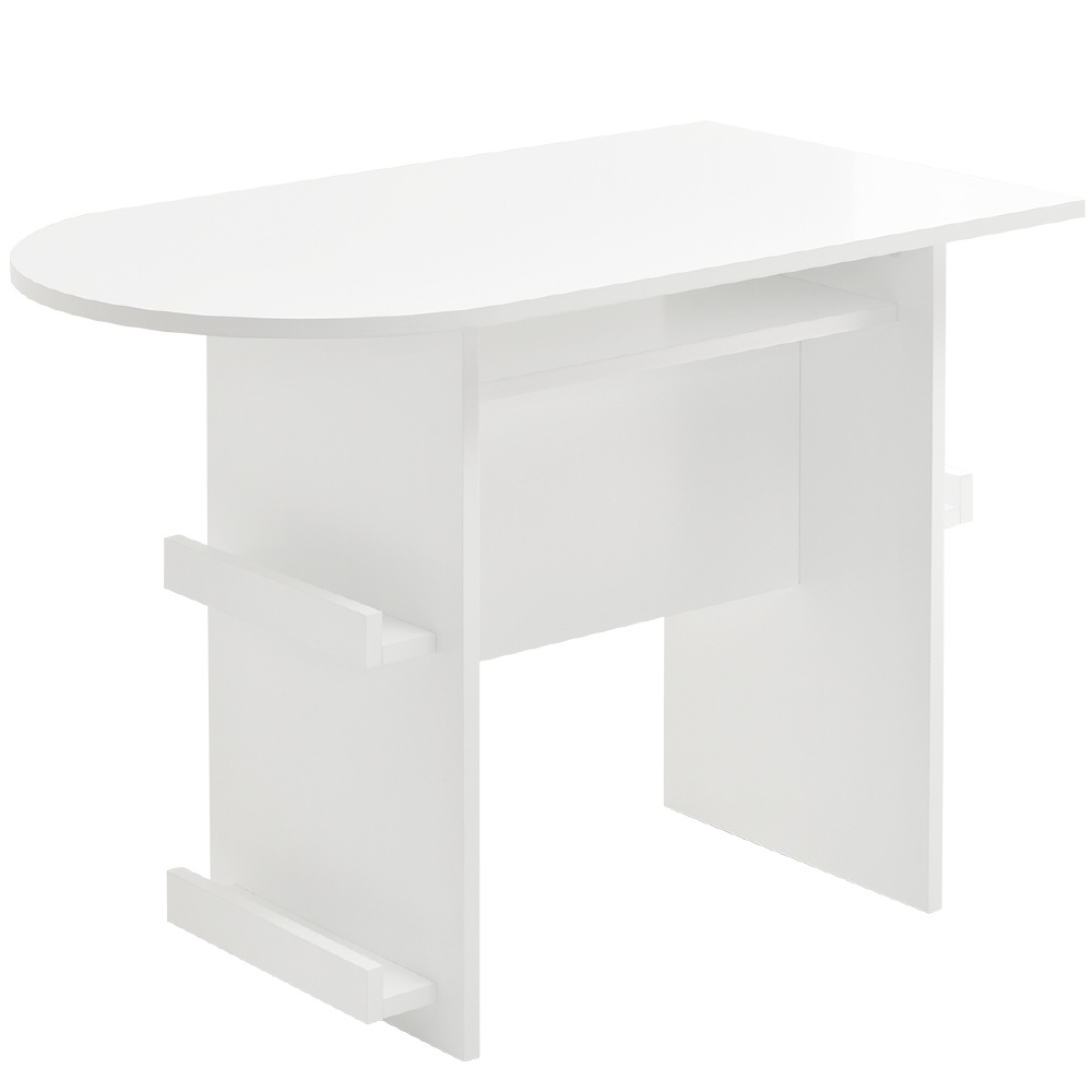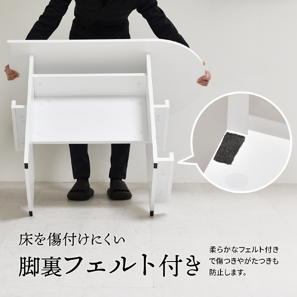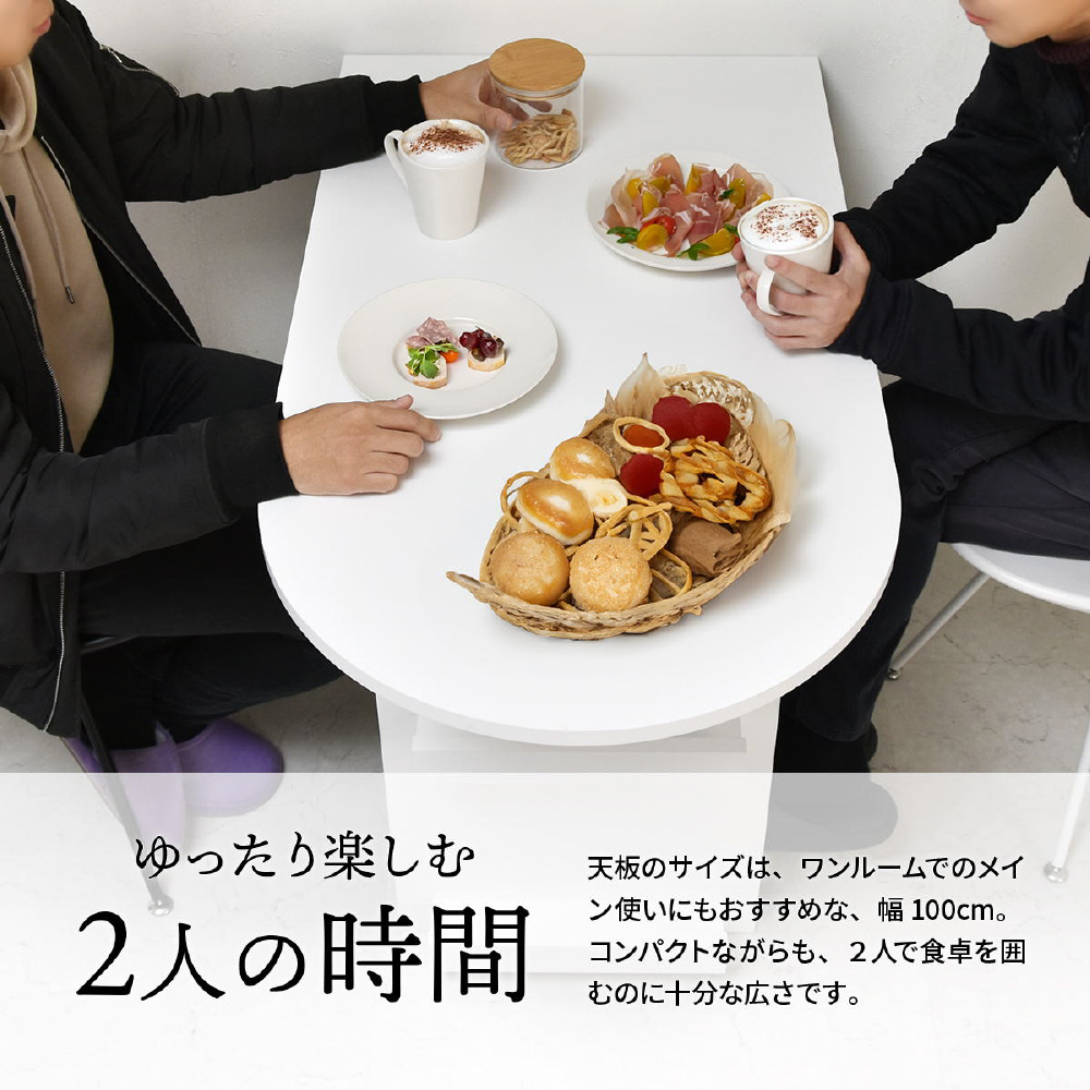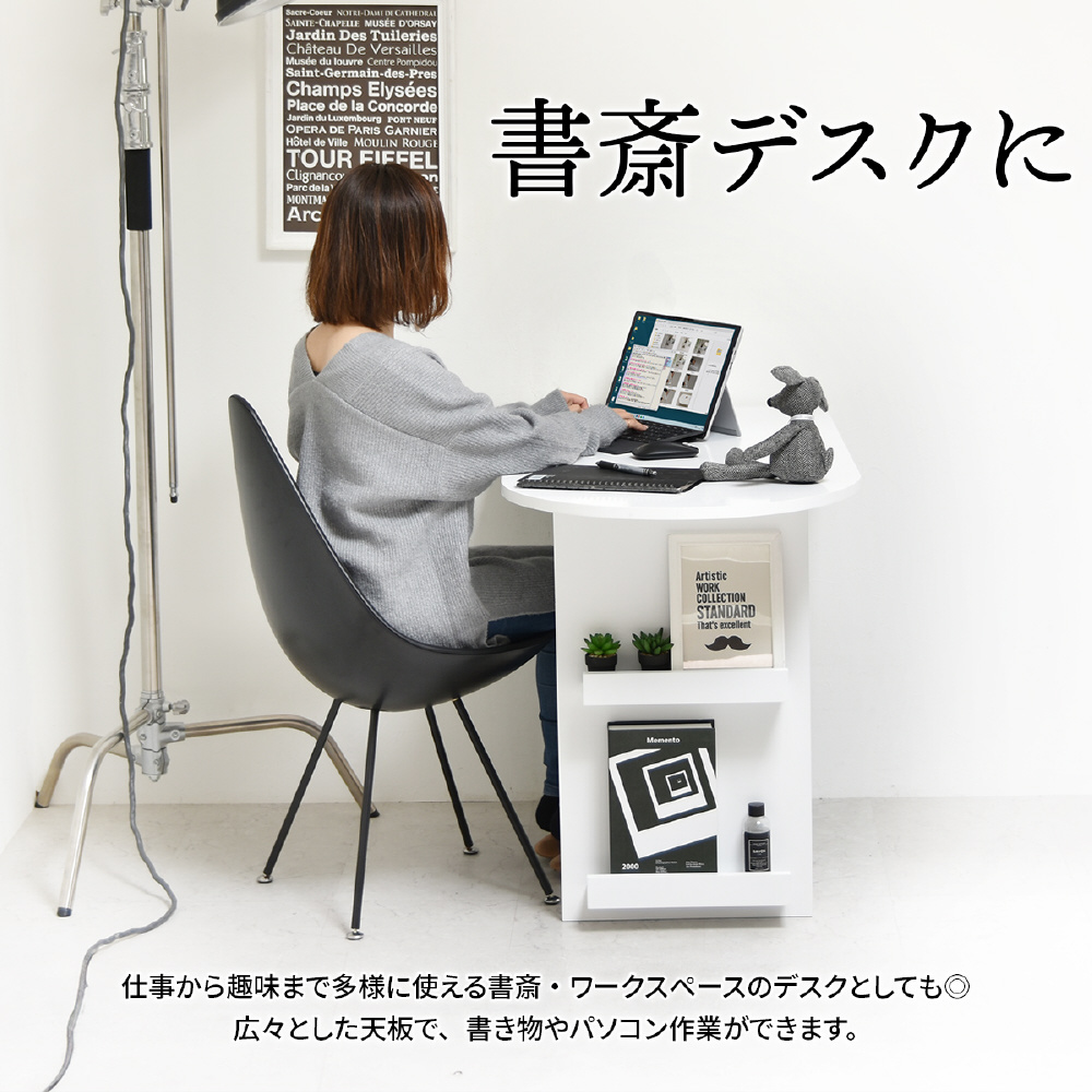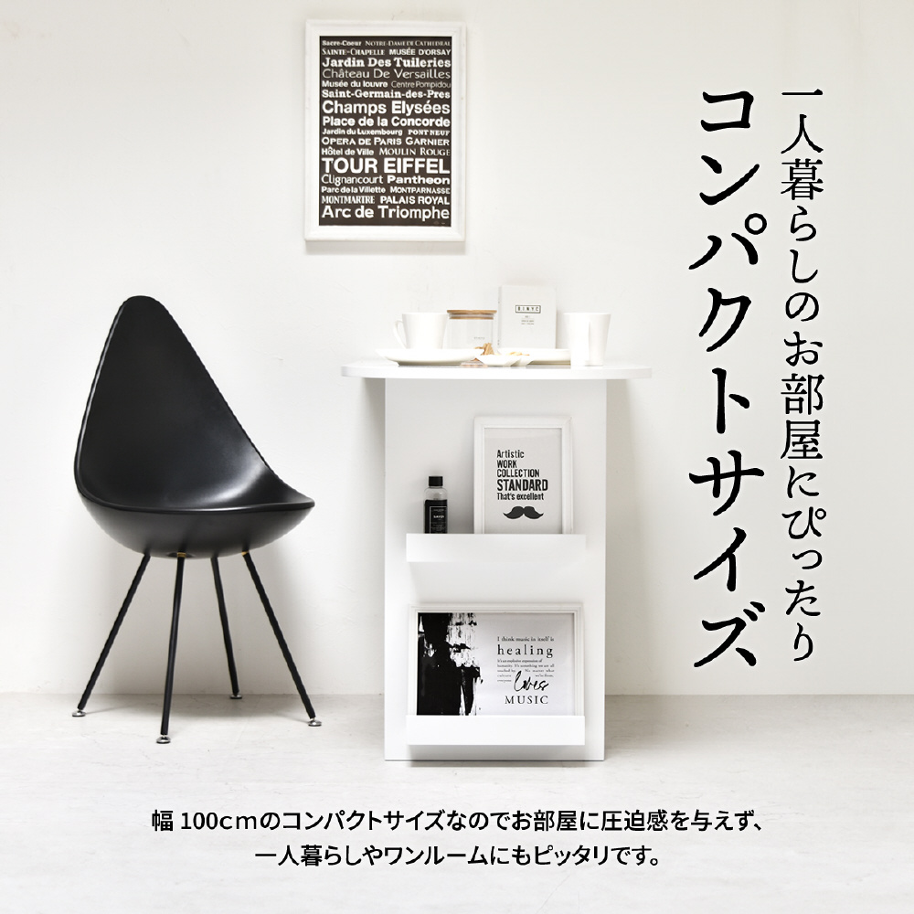 真っ白の天板で、しっかりとした造りとコンパクトなデザインの半円ダイニングテーブル。丸みを帯びたデザインがお部屋をスッキリと見立ててくれます。また左右の側板には、雑誌やケーブルタップを収納できる棚が付いていますので、見える棚には雑誌、見えない奥の棚にはタップコードなど収納できます。窓辺に向けて置いたり、キッチンカウンターと合わせて置くと、ちょっとしたカフェスペースに変身!