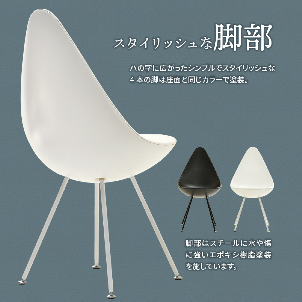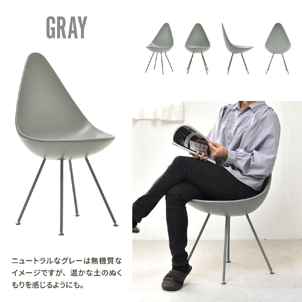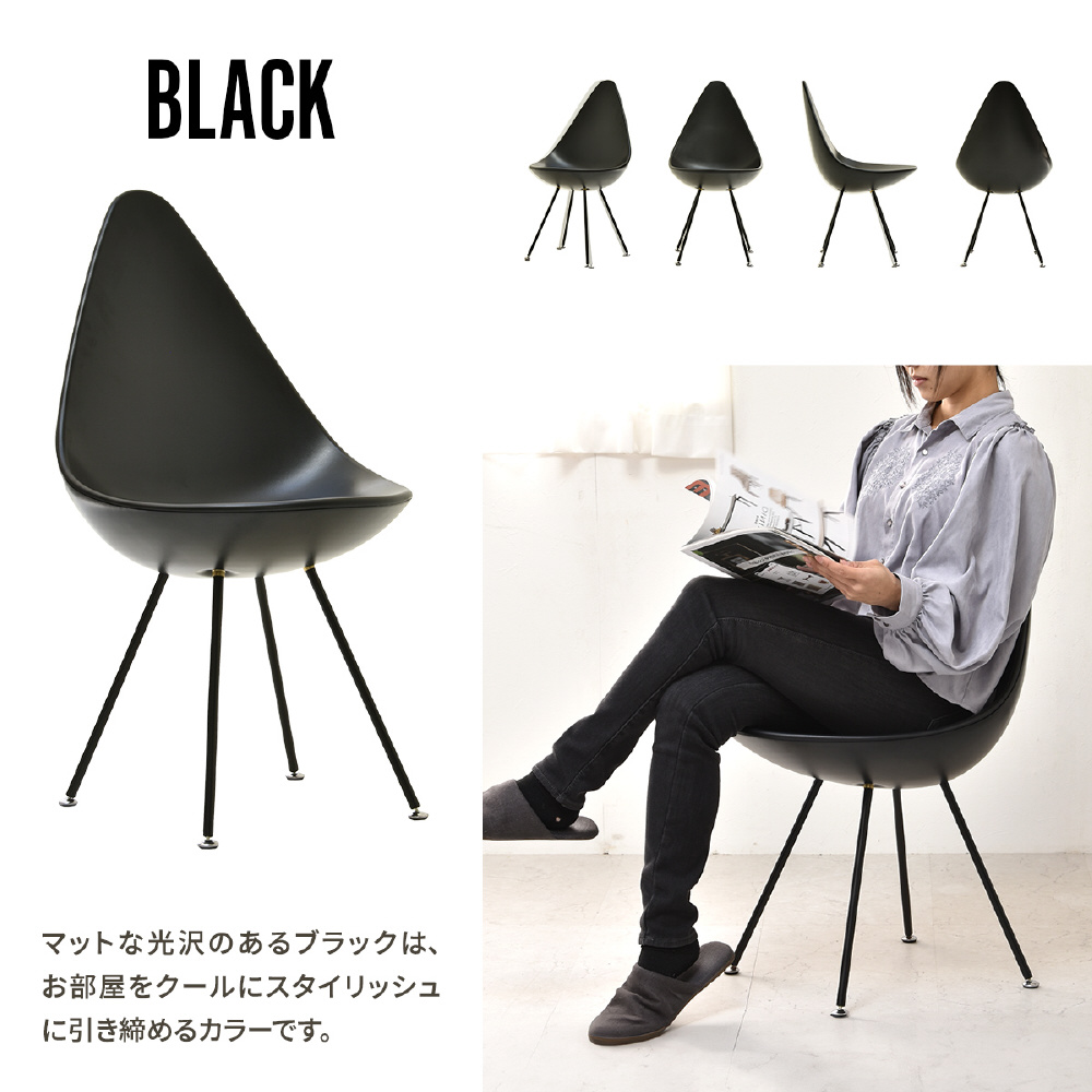 樹脂系素材を使用した、丸みを帯びた雫のようなフォルムでまるでオブジェのような独特の存在感を醸し出しているチェア。ハの字の脚部で安定性も良くスタイリッシュなデザイン。ぽってりとした愛らしいフォルムに癒されます。体にフィットするように設計された滑らかなドロップ型の曲線は、ダイニングやワークスペース、お部屋のワンポイントなど様々なシーンで活躍します。