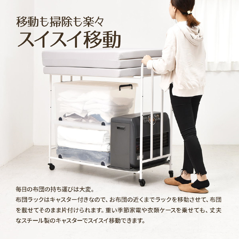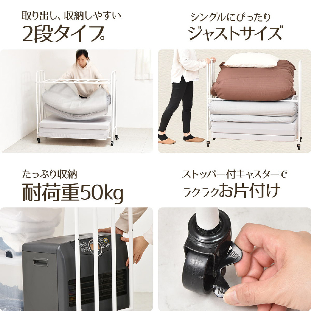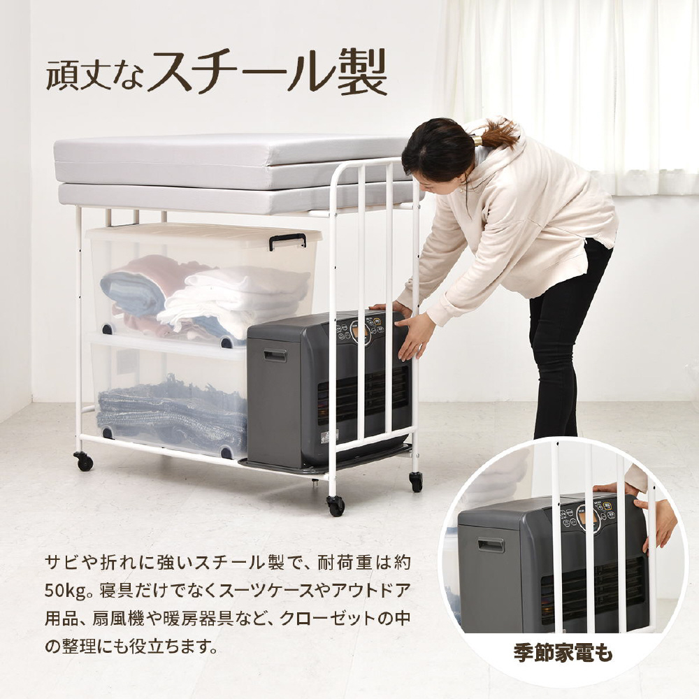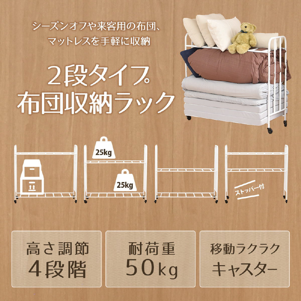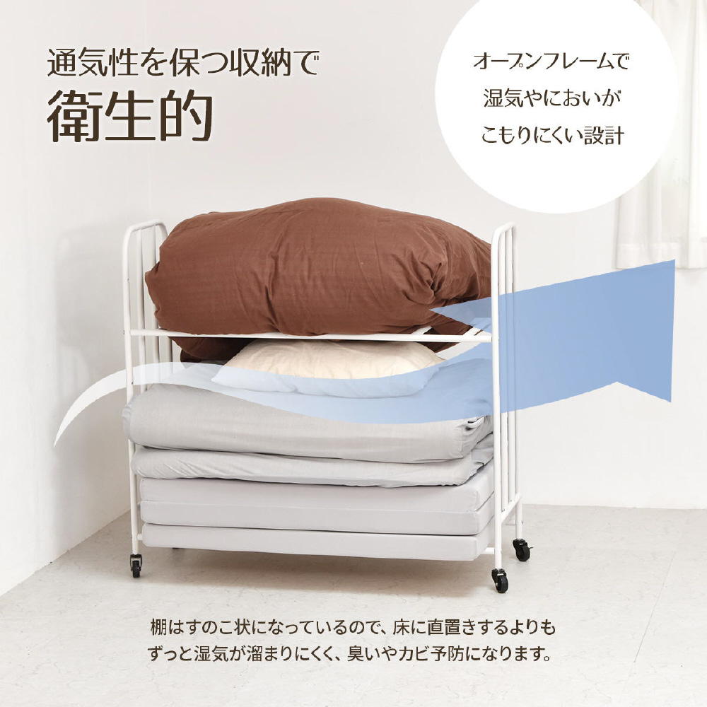 掛け布団や枕もまとめて収納できる、2段で大容量の布団収納ラック。丈夫なキャスターが付いていますので移動もラクラクです。通気性抜群の収納ラックは、床に直置きしませんので、湿気が溜まりにくく、臭いやカビ予防になります。収納する布団の厚みや枚数、折りたたみマットレスなどに合わせて、高さ調整も出来ますので、ご使用に応じた収納ができます。シーズンオフや来客用の布団、マットレスを手軽に収納します。