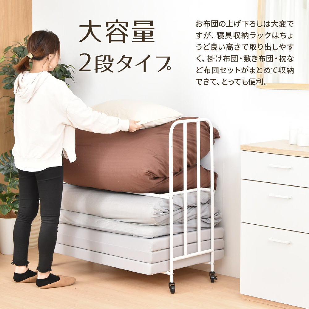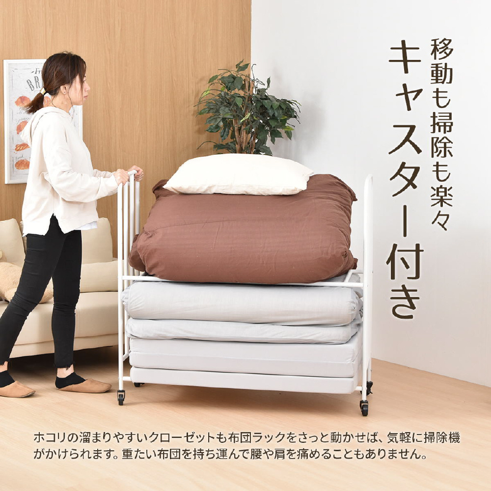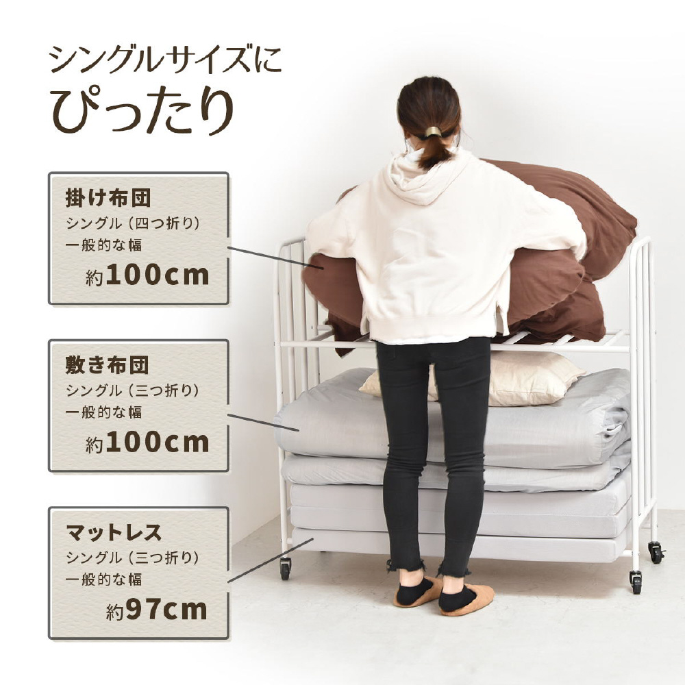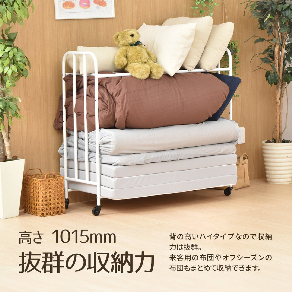 掛け布団や枕もまとめて収納できる、2段で大容量の布団収納ラック。丈夫なキャスターが付いていますので移動もラクラクです。通気性抜群の収納ラックは、床に直置きしませんので、湿気が溜まりにくく、臭いやカビ予防になります。収納する布団の厚みや枚数、折りたたみマットレスなどに合わせて、高さ調整も出来ますので、ご使用に応じた収納ができます。シーズンオフや来客用の布団、マットレスを手軽に収納します。