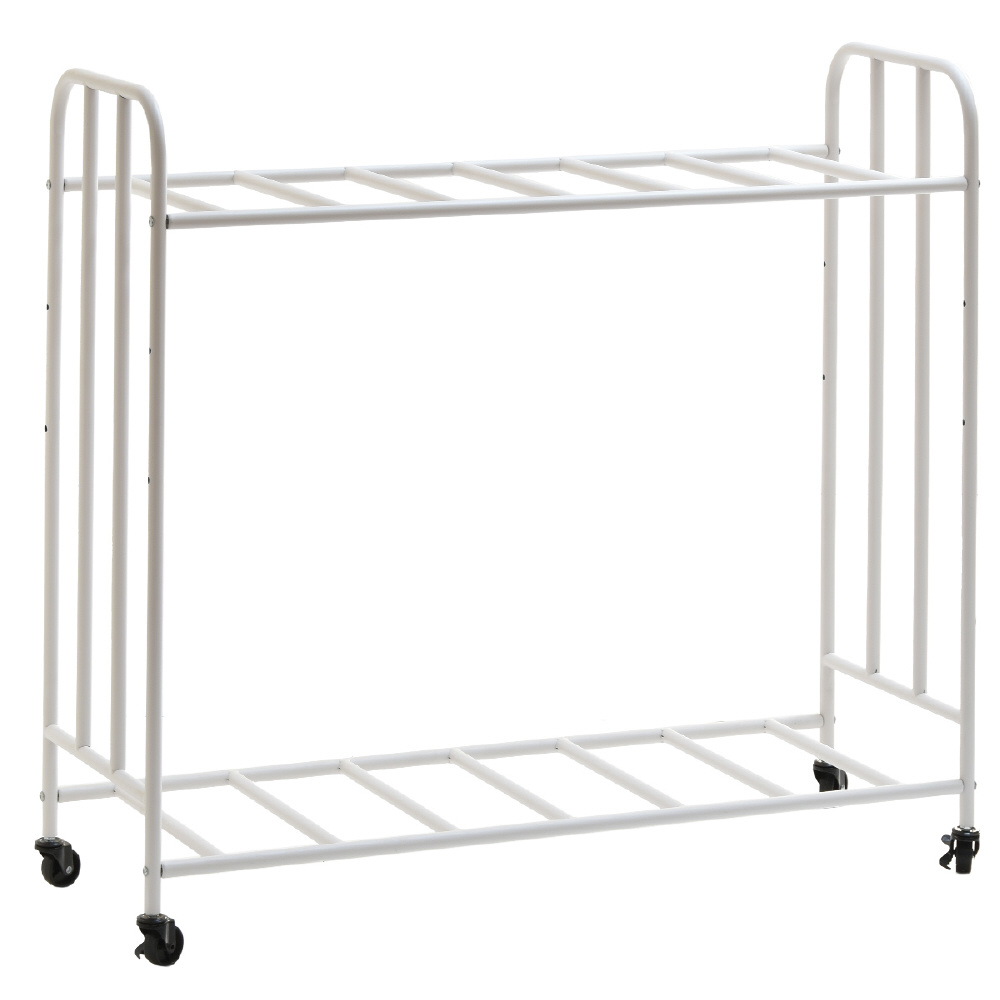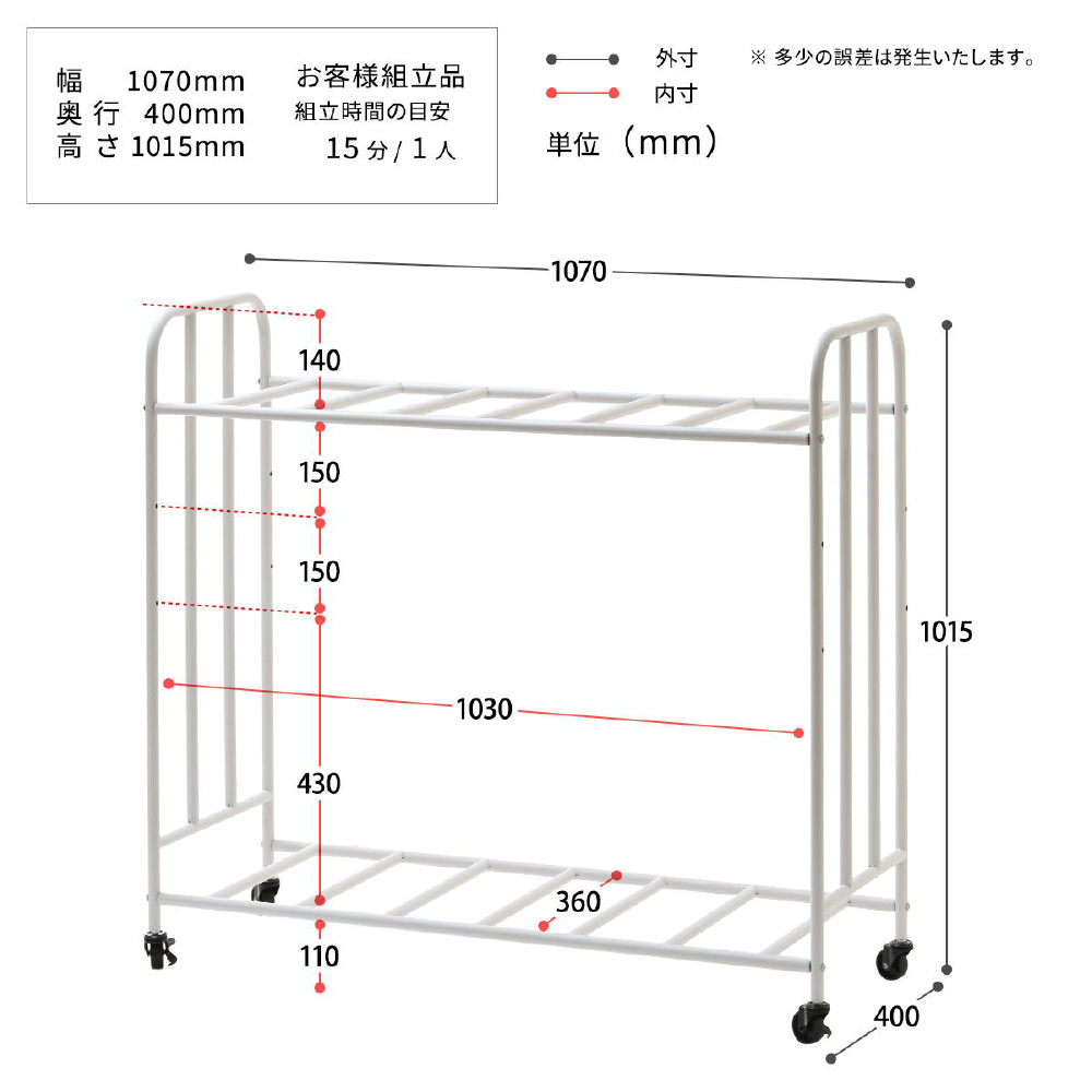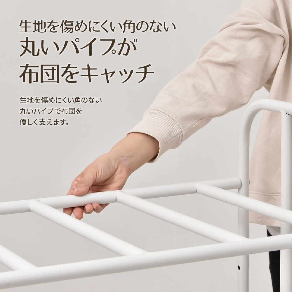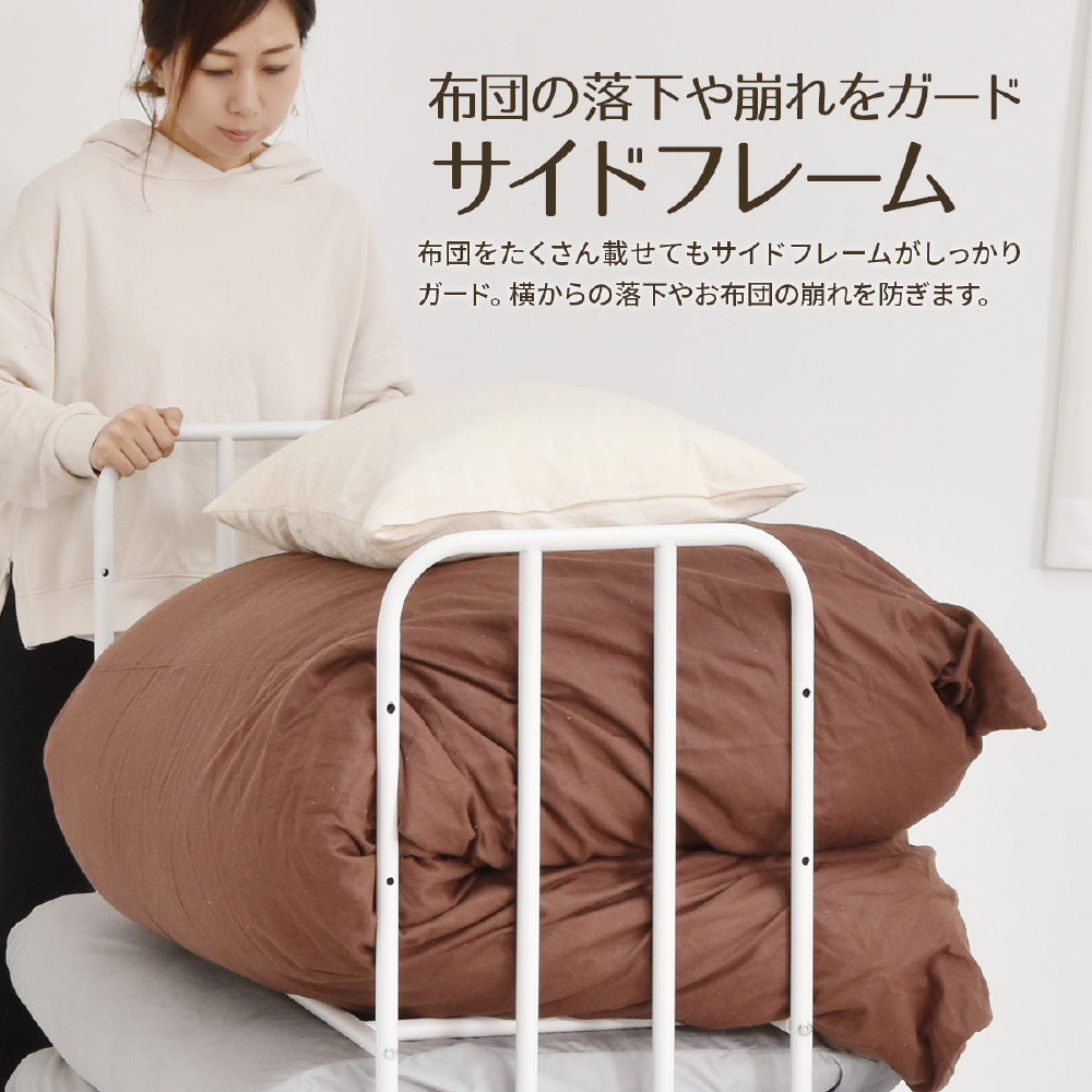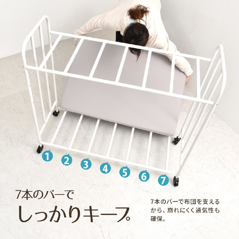 掛け布団や枕もまとめて収納できる、2段で大容量の布団収納ラック。丈夫なキャスターが付いていますので移動もラクラクです。通気性抜群の収納ラックは、床に直置きしませんので、湿気が溜まりにくく、臭いやカビ予防になります。収納する布団の厚みや枚数、折りたたみマットレスなどに合わせて、高さ調整も出来ますので、ご使用に応じた収納ができます。シーズンオフや来客用の布団、マットレスを手軽に収納します。