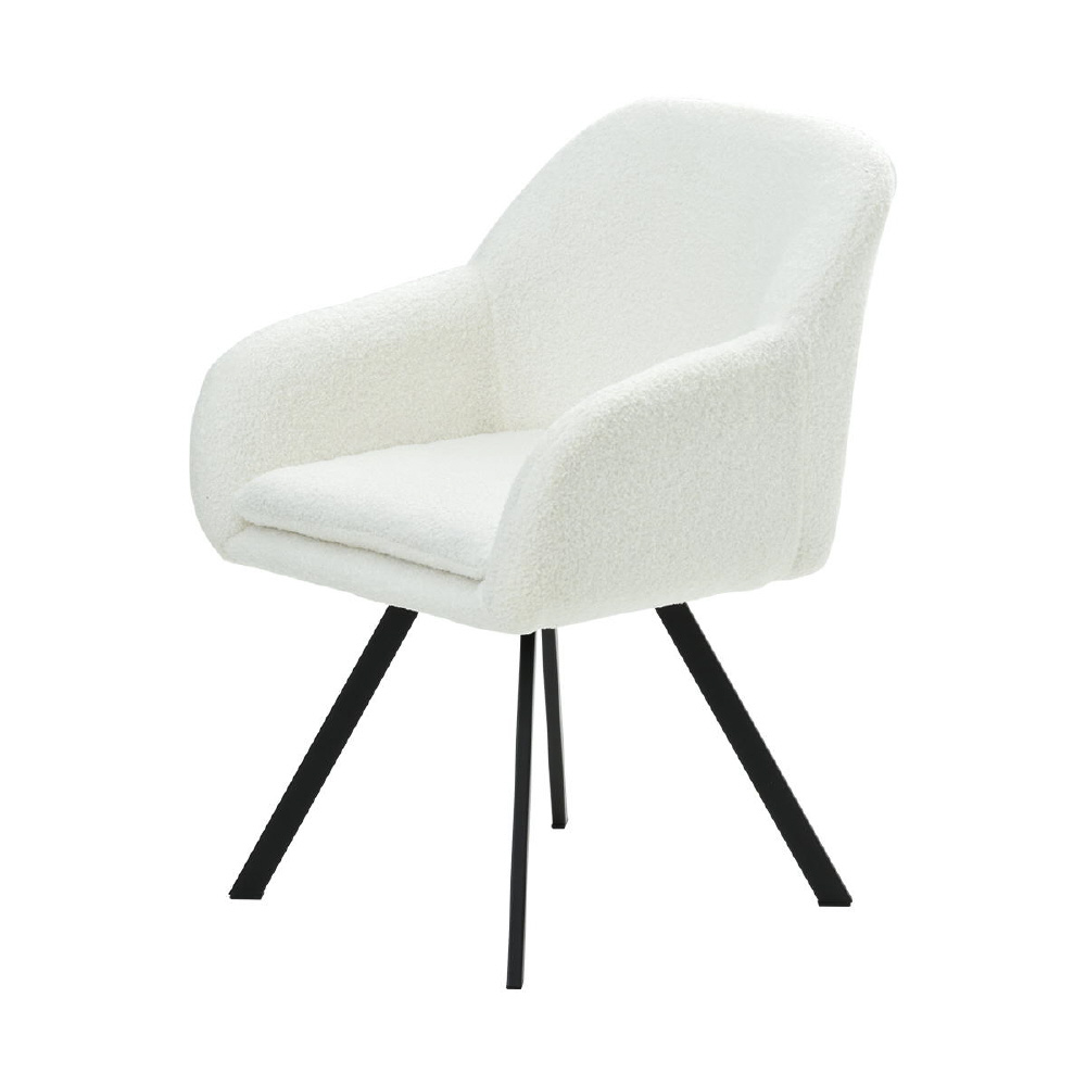 モダンなデザインのブークレ素材の回転機能付きダイニングチェア。優れた快適さと耐久性を備えています。長時間の食事や会話を楽しむのに最適です。ファブリックは触り心地がやわらかなブークレ素材。洗練されたデザインは、どんなインテリアにも調和し、快適な座り心地を提供します。上品さを醸し出しながらも甘すぎないベーシックなデザインは、モダンで落ち着いた大人の空間を演出します。
