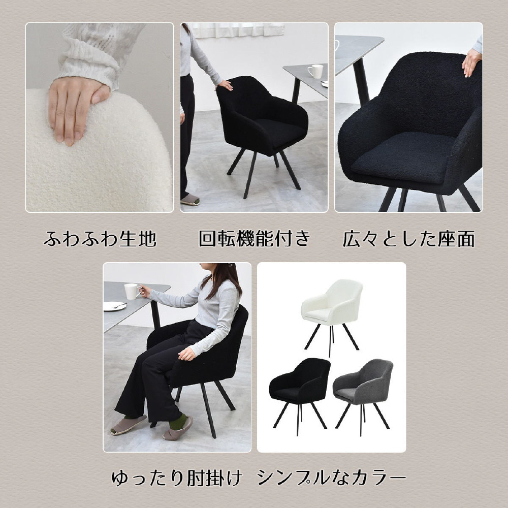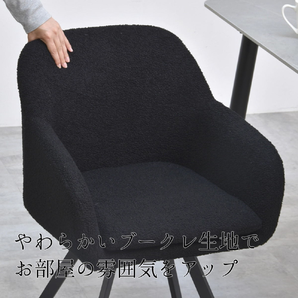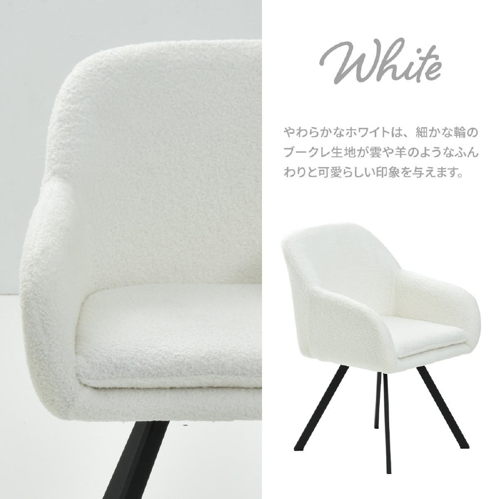 モダンなデザインのブークレ素材の回転機能付きダイニングチェア。優れた快適さと耐久性を備えています。長時間の食事や会話を楽しむのに最適です。ファブリックは触り心地がやわらかなブークレ素材。洗練されたデザインは、どんなインテリアにも調和し、快適な座り心地を提供します。上品さを醸し出しながらも甘すぎないベーシックなデザインは、モダンで落ち着いた大人の空間を演出します。