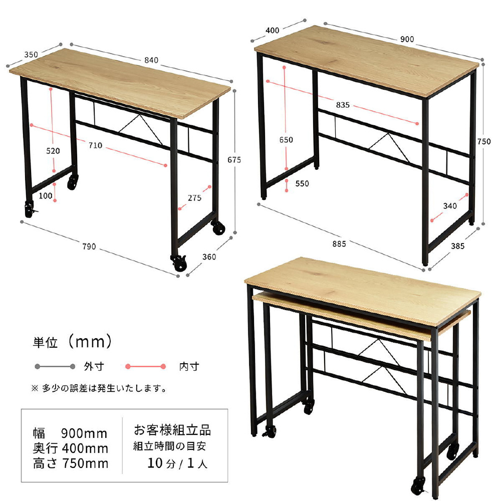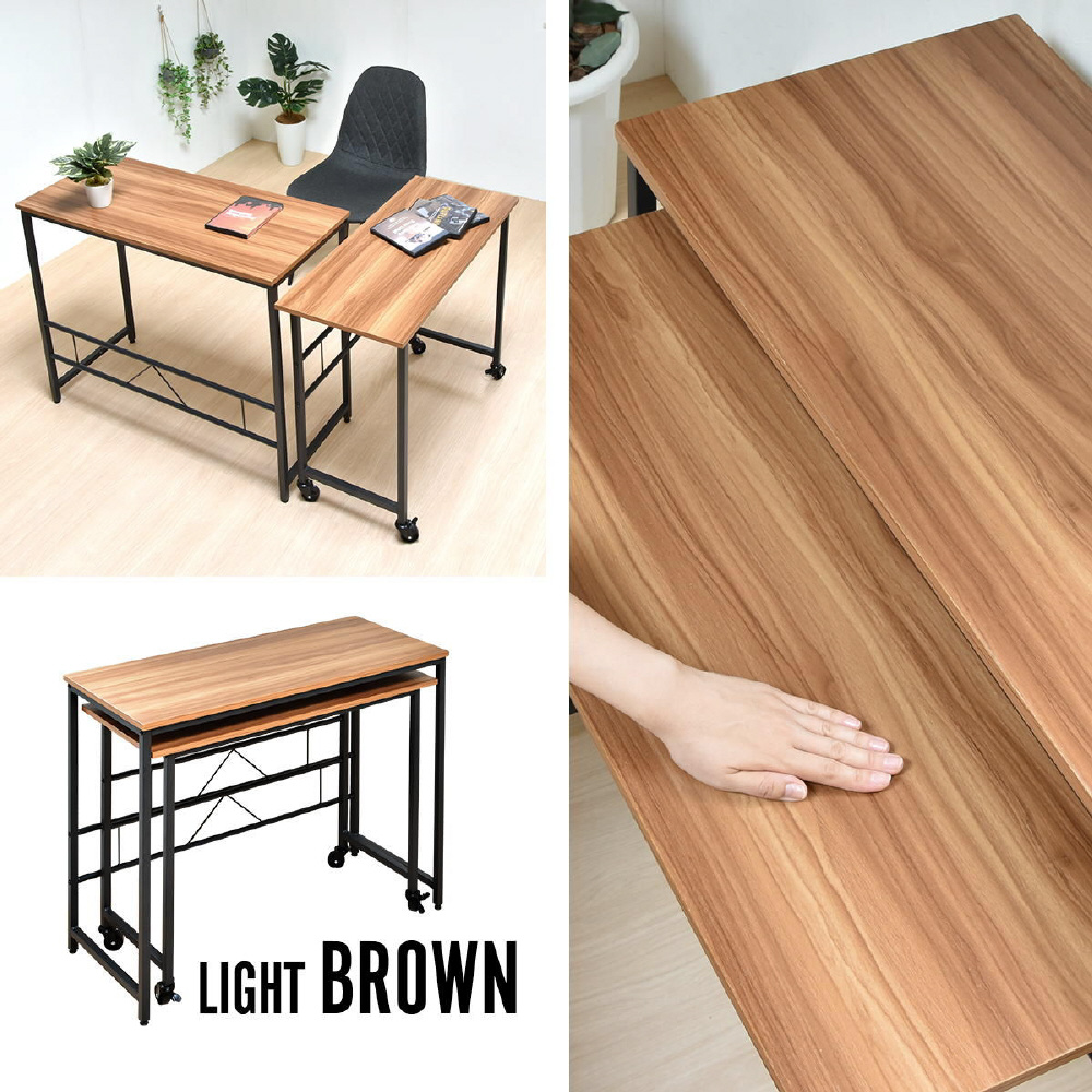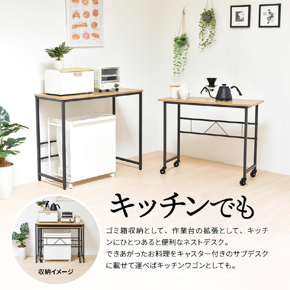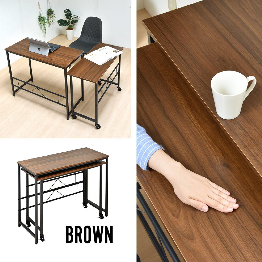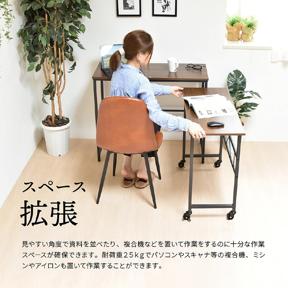 メインデスクとサブデスクがそれぞれ独立し、重ねたり並べたりL字に置いたりと自由に配置できるデスクです。 サブデスクにはキャスターがついているのでワゴンの代わりとしても使用できます。