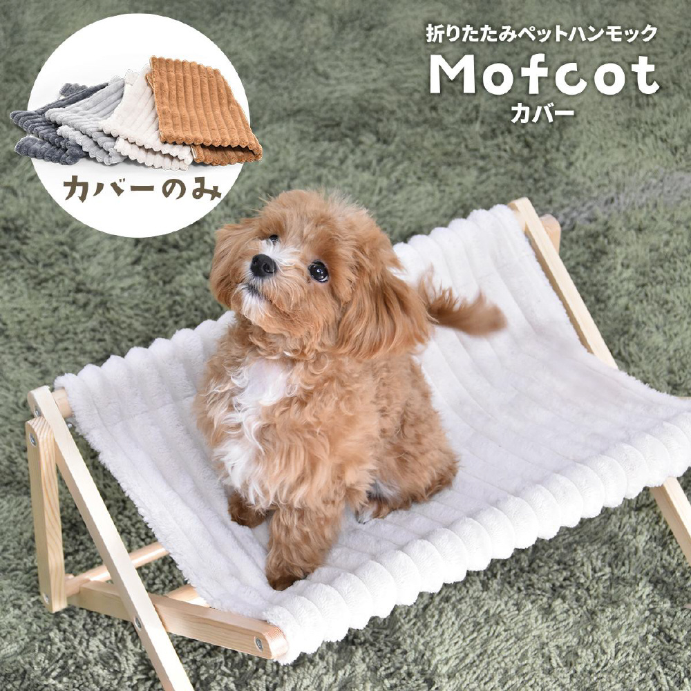折りたたみペットハンモック Mofcotは、折りたたんで持ち運びのできるペット用の簡易ベッドです。フレームにはパインの天然木を使用し、カバー部分の表面には毛足の長い肌触りの良い生地、裏面にはさらりとした肌触りのしっかりめの生地を使用しております。カバーは汚れても洗濯可能ですし、万が一ベースが破損したり、カバーが破れてしまっても、それぞれ単品での販売もしておりますので長く使っていただけます。