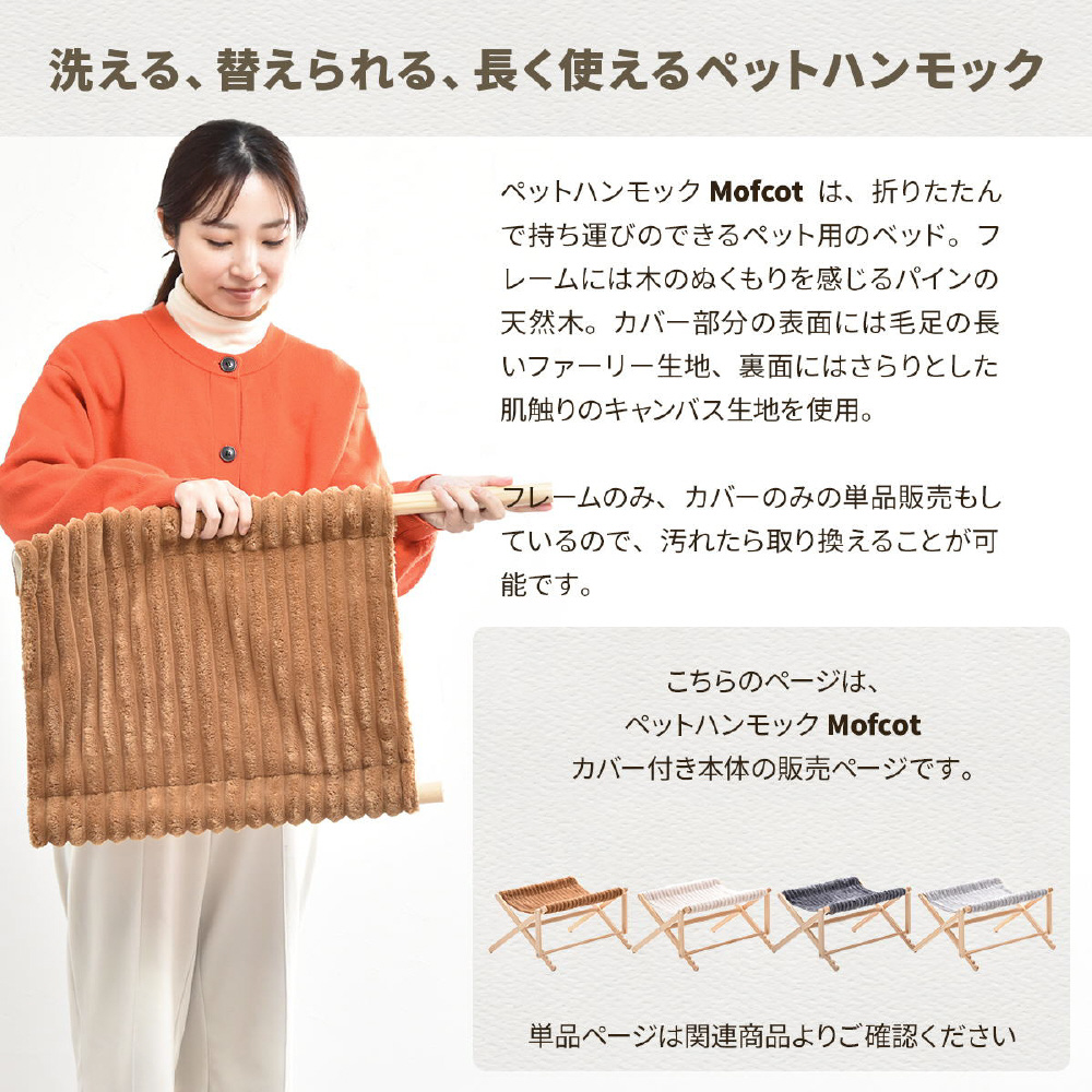 折りたたみペットハンモック Mofcotは、折りたたんで持ち運びのできるペット用の簡易ベッドです。フレームにはパインの天然木を使用し、カバー部分の表面には毛足の長い肌触りの良い生地、裏面にはさらりとした肌触りのしっかりめの生地を使用しております。カバーは汚れても洗濯可能ですし、万が一ベースが破損したり、カバーが破れてしまっても、それぞれ単品での販売もしておりますので長く使っていただけます。