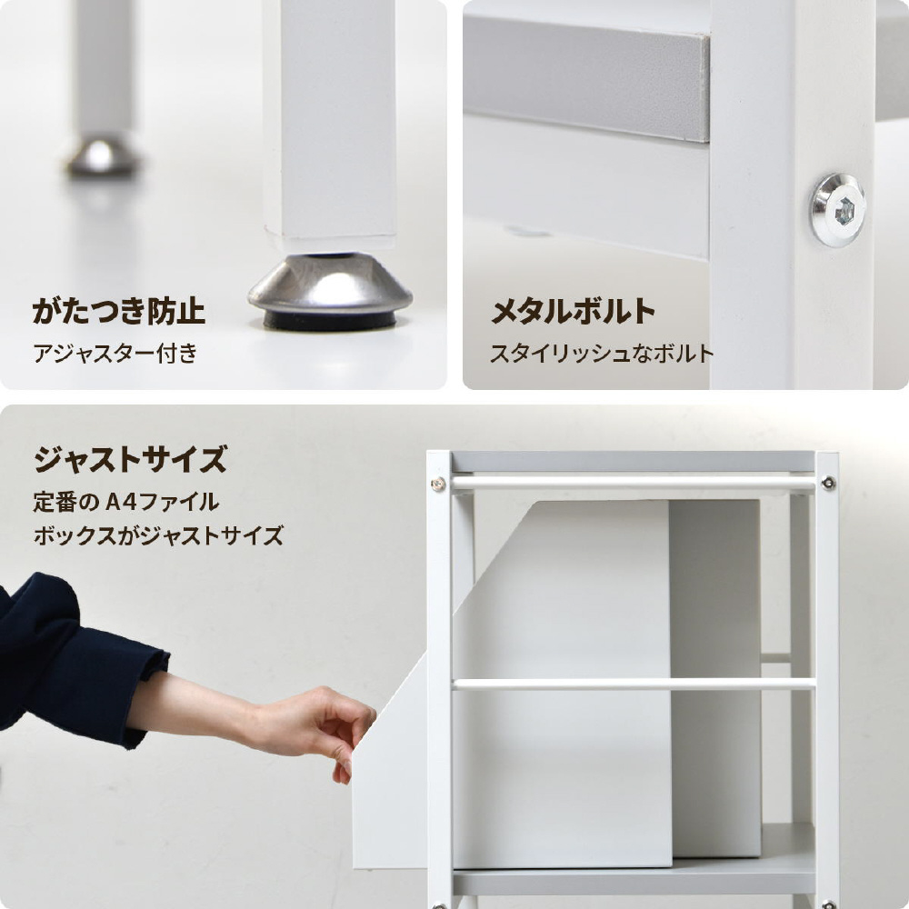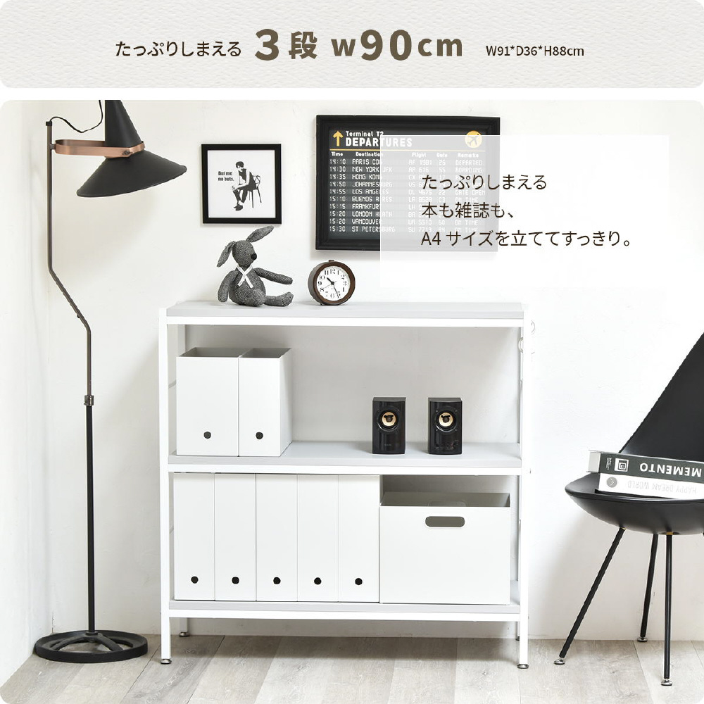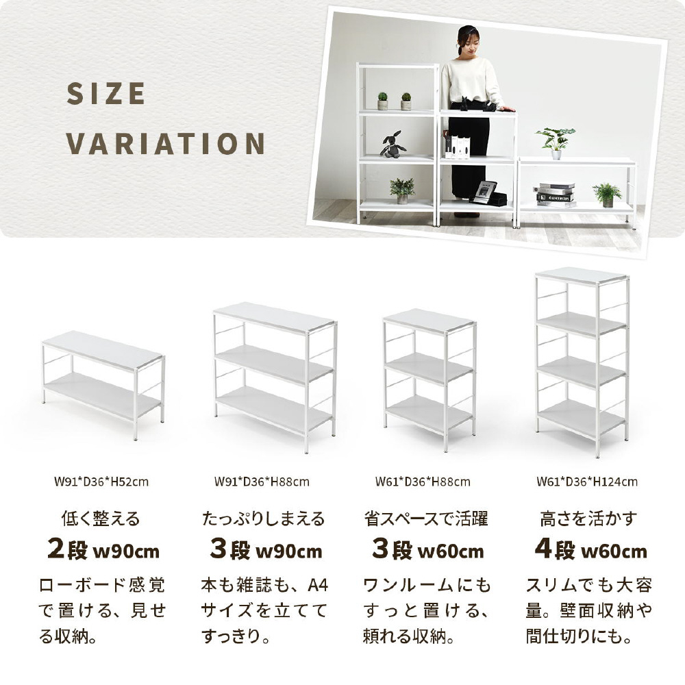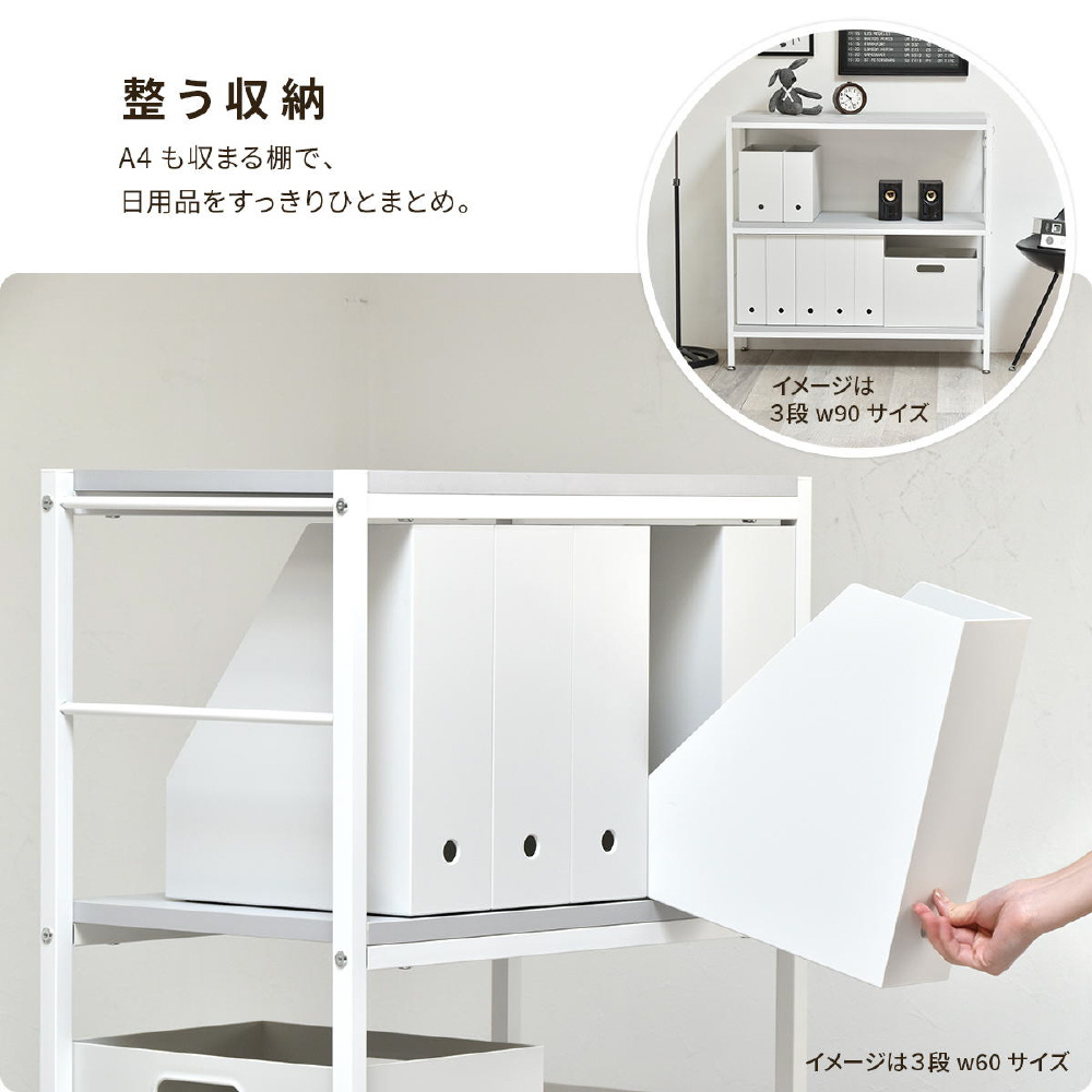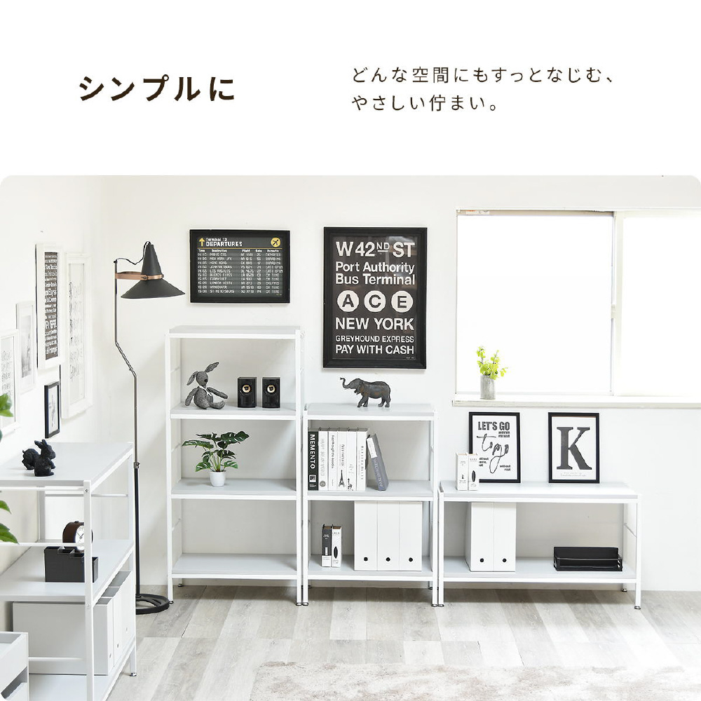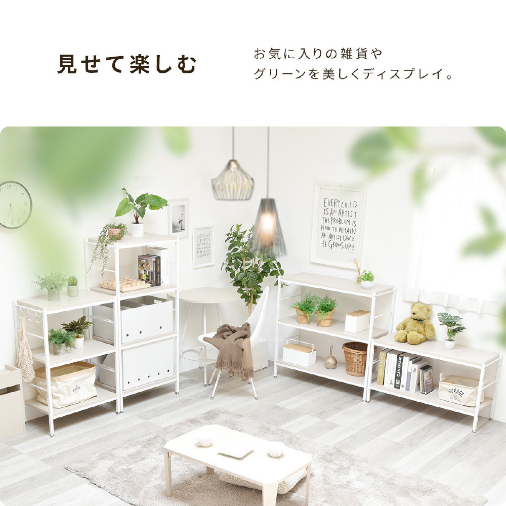 ホワイトフレームに柔らかいニュアンスカラーの天板、棚板が特徴的な、Nokoシリーズのラック。シンプルな構造でお部屋のの雰囲気を優しい印象にしてくれます。 壁面で使用するだけでなく空間の間仕切りとしても圧迫感なく活躍してくれます。収納スペースの高さは32cm。A4ファイルも収まる高さがあるので、雑誌なども立てて収納できます。