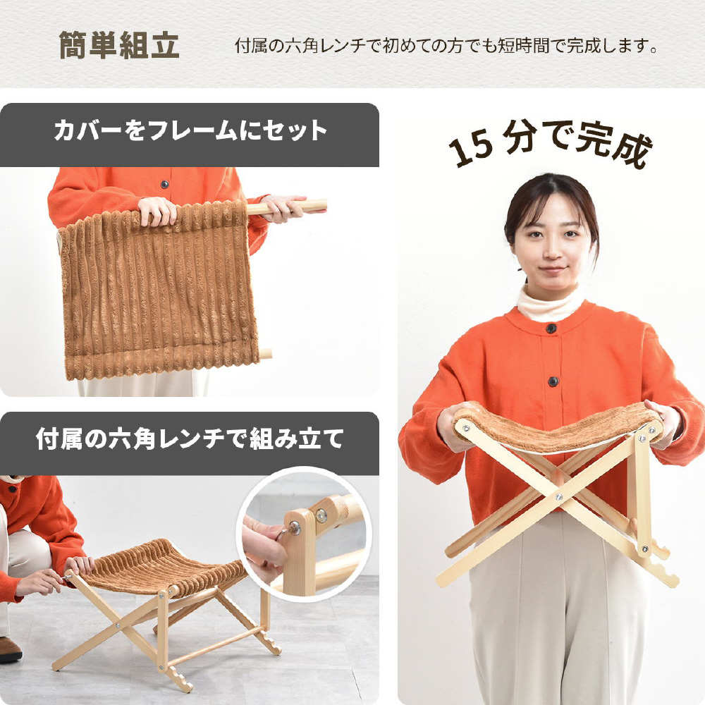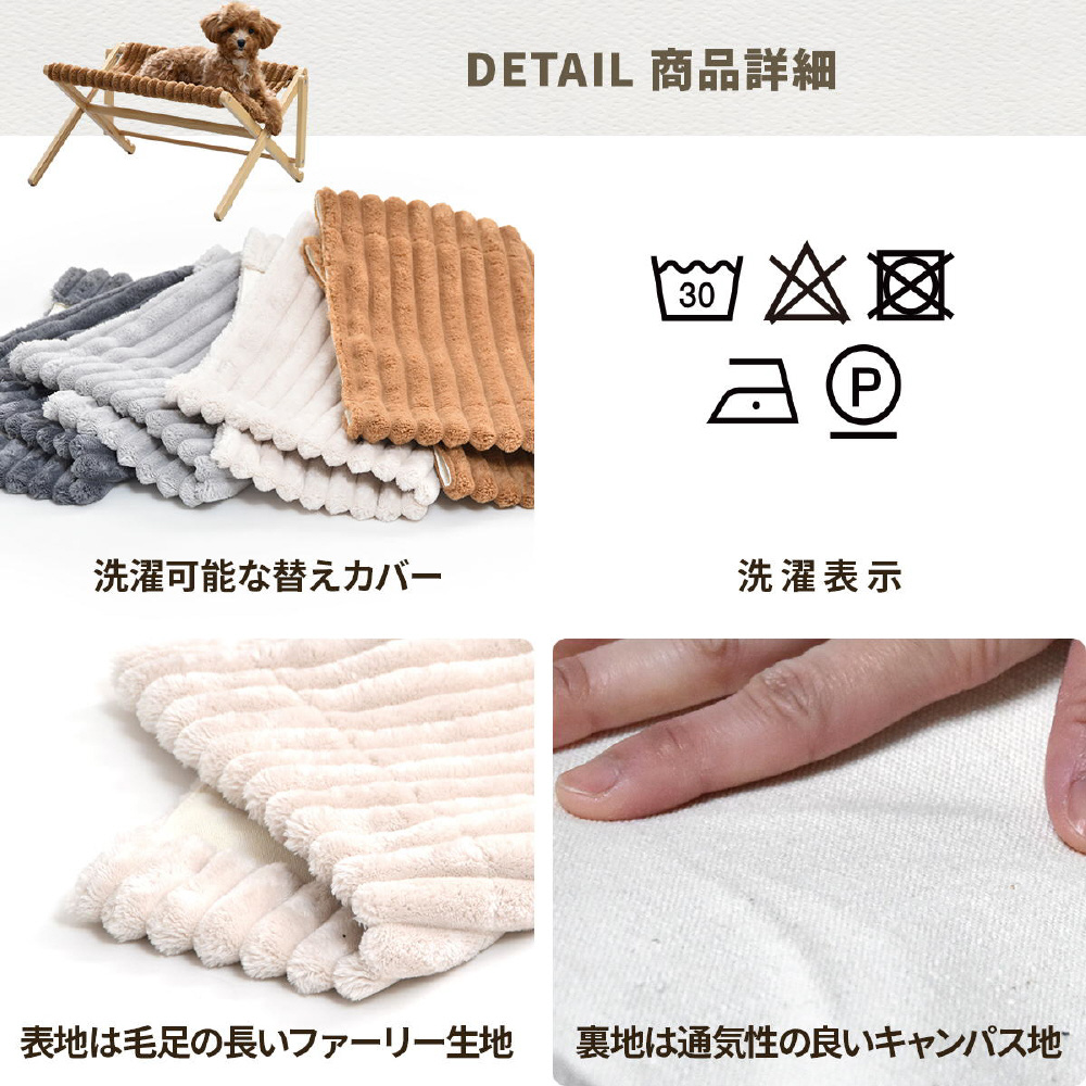 折りたたみペットハンモック Mofcotは、折りたたんで持ち運びのできるペット用の簡易ベッドです。フレームにはパインの天然木を使用し、カバー部分の表面には毛足の長い肌触りの良い生地、裏面にはさらりとした肌触りのしっかりめの生地を使用しております。カバーは汚れても洗濯可能ですし、万が一ベースが破損したり、カバーが破れてしまっても、それぞれ単品での販売もしておりますので長く使っていただけます。