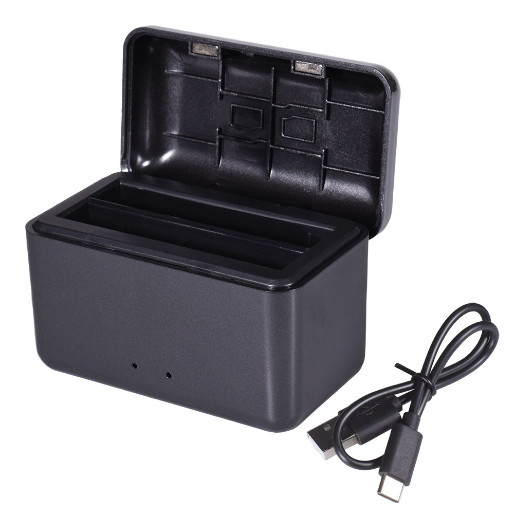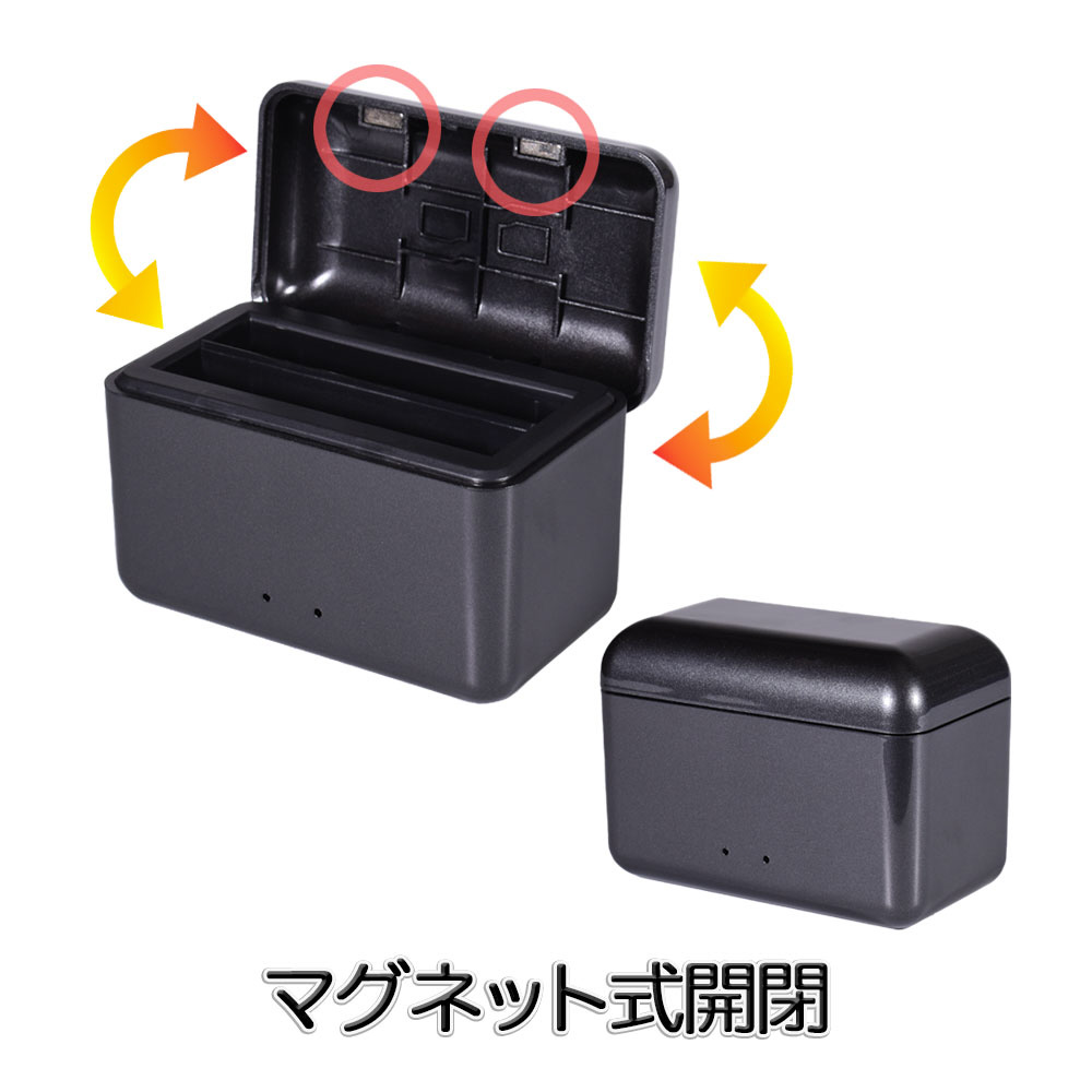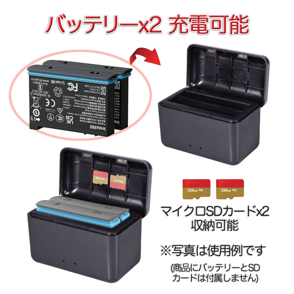 Insta360 X4用2個同時充電可能なバッテリーチャージャーです。フタ部分にはmicroSDカード2枚を収納できるスロットを装備し、コンパクトに持ち運べます。