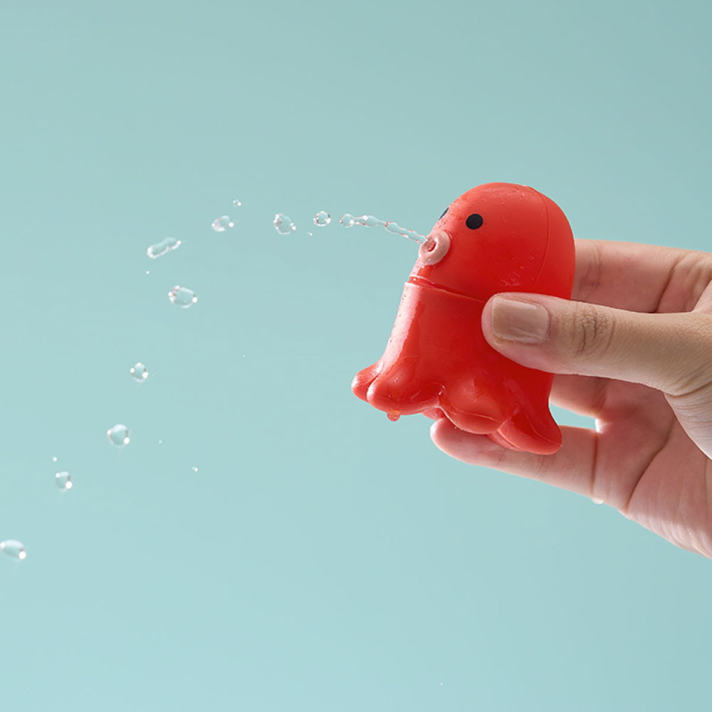 やわらかいシリコーン製のおもちゃは、にぎるとお水がピューっと出て水でっぽう遊びができます。