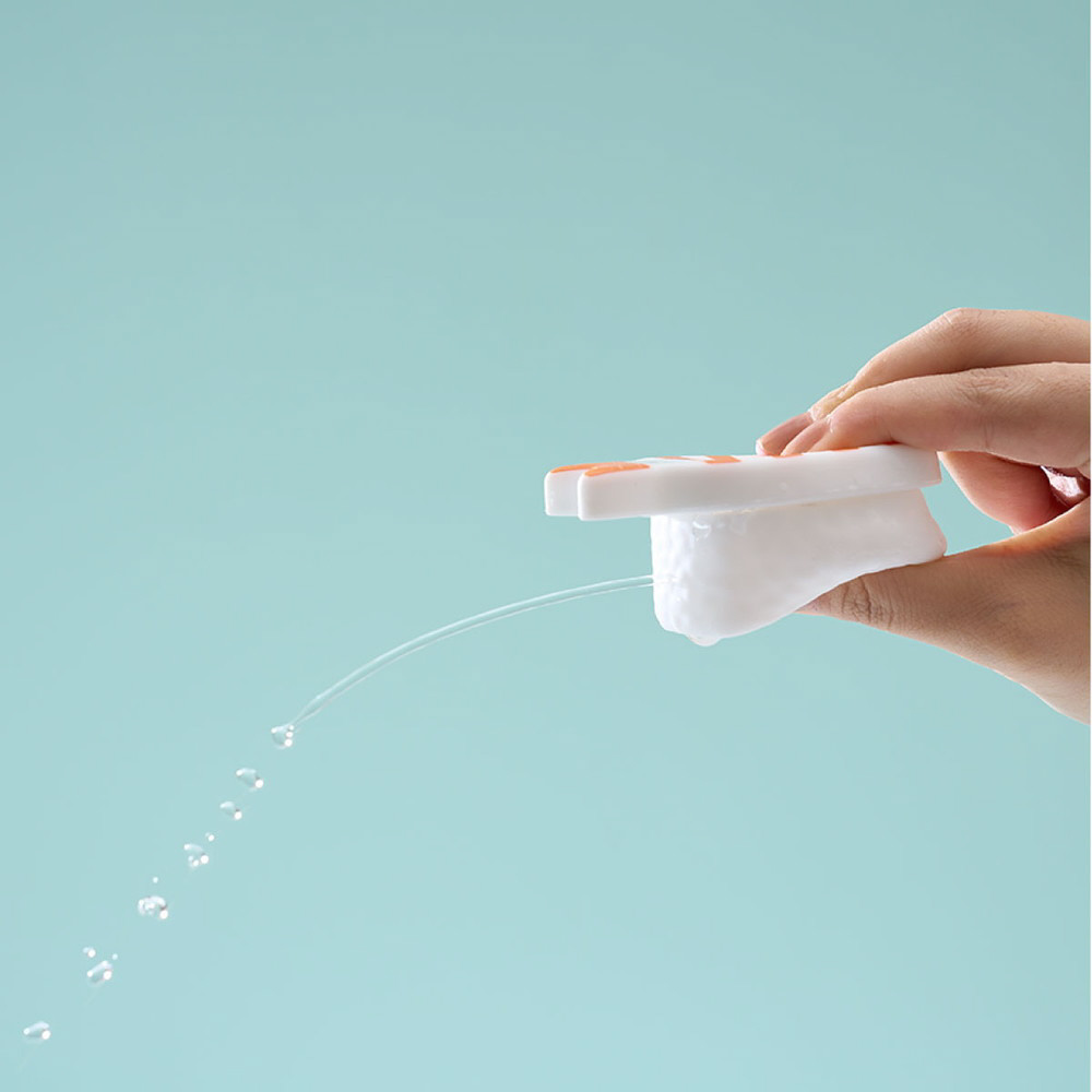 やわらかいシリコーン製のおもちゃは、にぎるとお水がピューっと出て水でっぽう遊びができます。