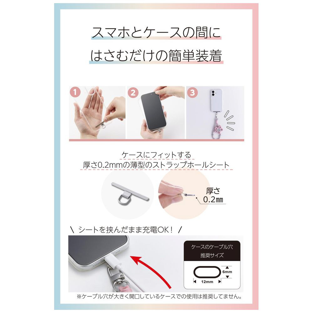 ケースにストラップホールがなくても、付属のストラップホールシートをスマートフォンとケースの間に挟むだけで使用でき、取り外しも簡単です。