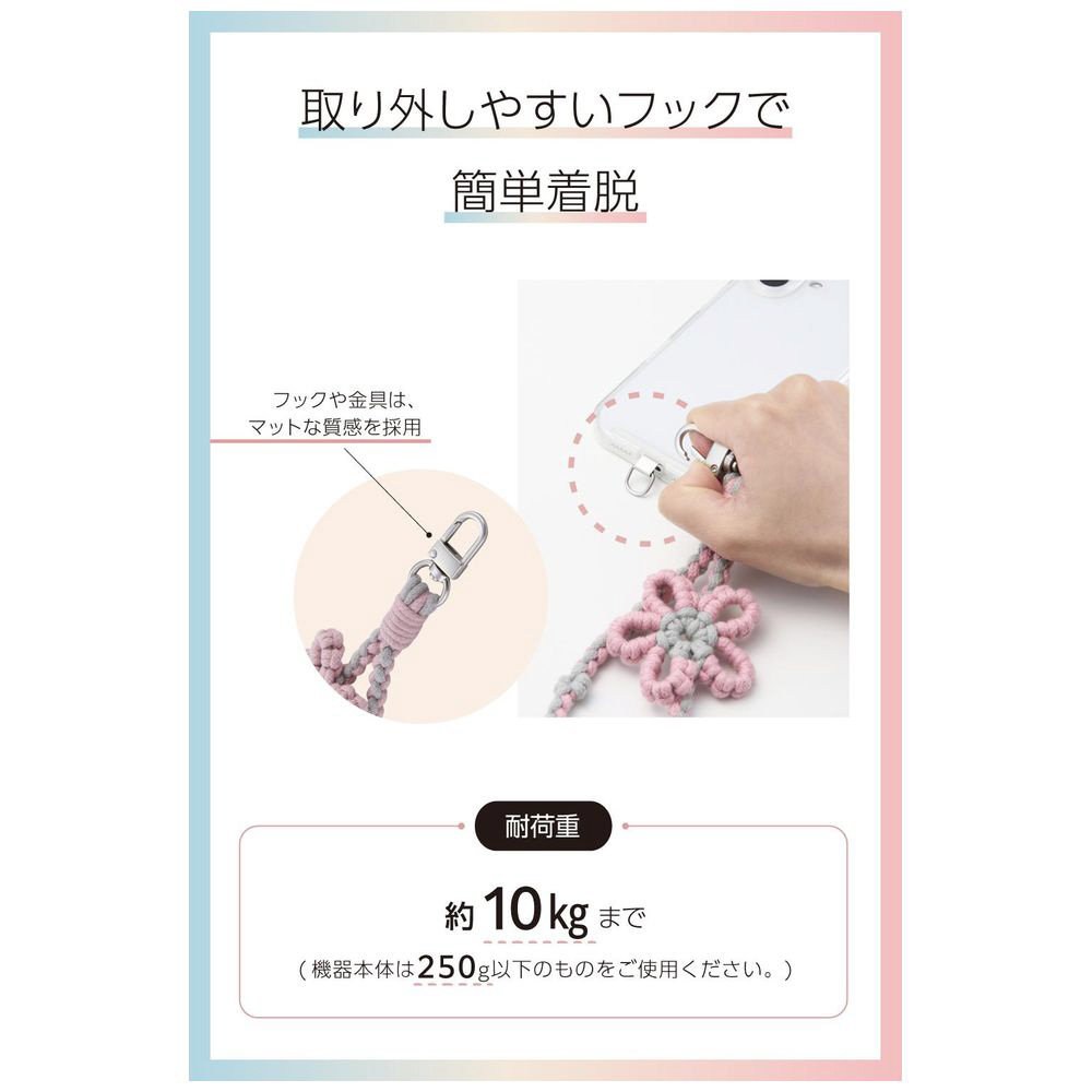 手元にやさしくなじむ綿素材に、お花のモチーフが映える華やかなアクセントを添えたハンドストラップです。手首や腕から提げて持ち歩けるので、両手がふさがらずいつでもサッとスマートフォンの操作ができます。カラビナは1か所のみの軽量仕様で、アクセサリー感覚で気軽に使えます。