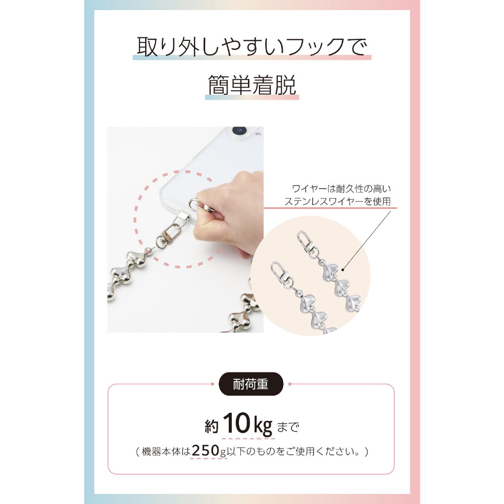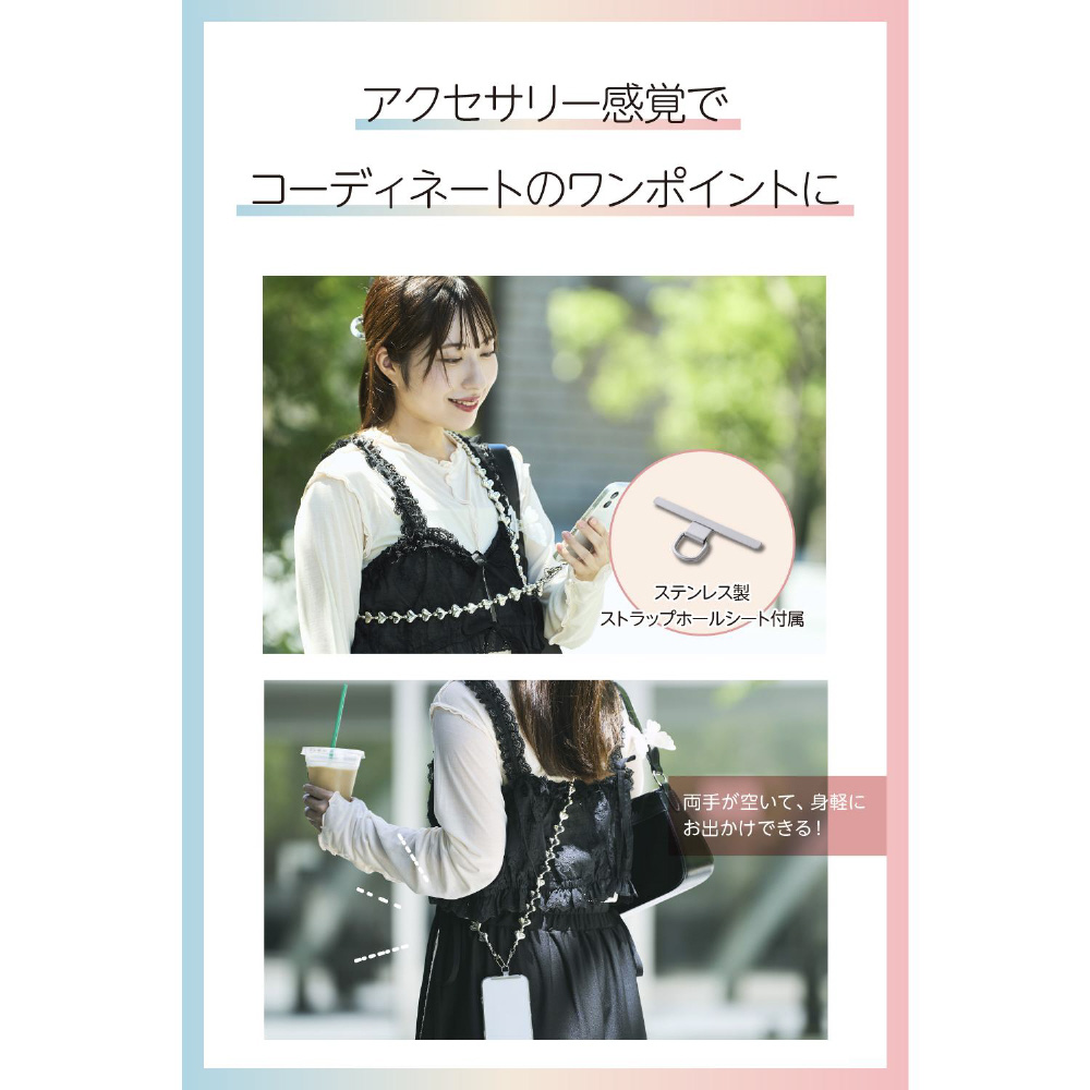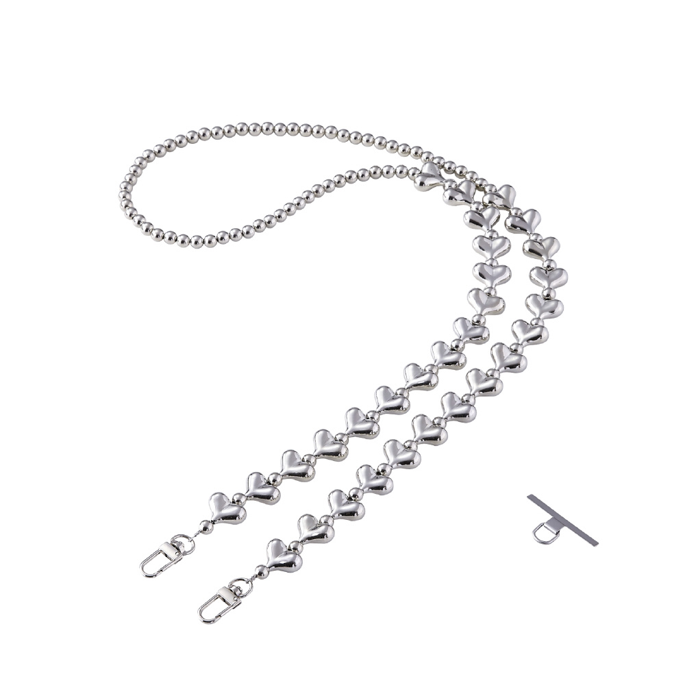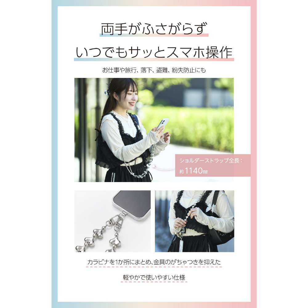ハートをたっぷり詰め込んだシルバービーズが、ストリートやモード系コーデに映えるクールなショルダーストラップです。両手が空いて、普段のお出かけはもちろん、お仕事や旅行などのイベント時にも活躍。落下、盗難、紛失防止にもなります。耐久性の高いステンレスワイヤーを使用しており、見た目の華やかさと実用性を兼ね備えた仕様です。