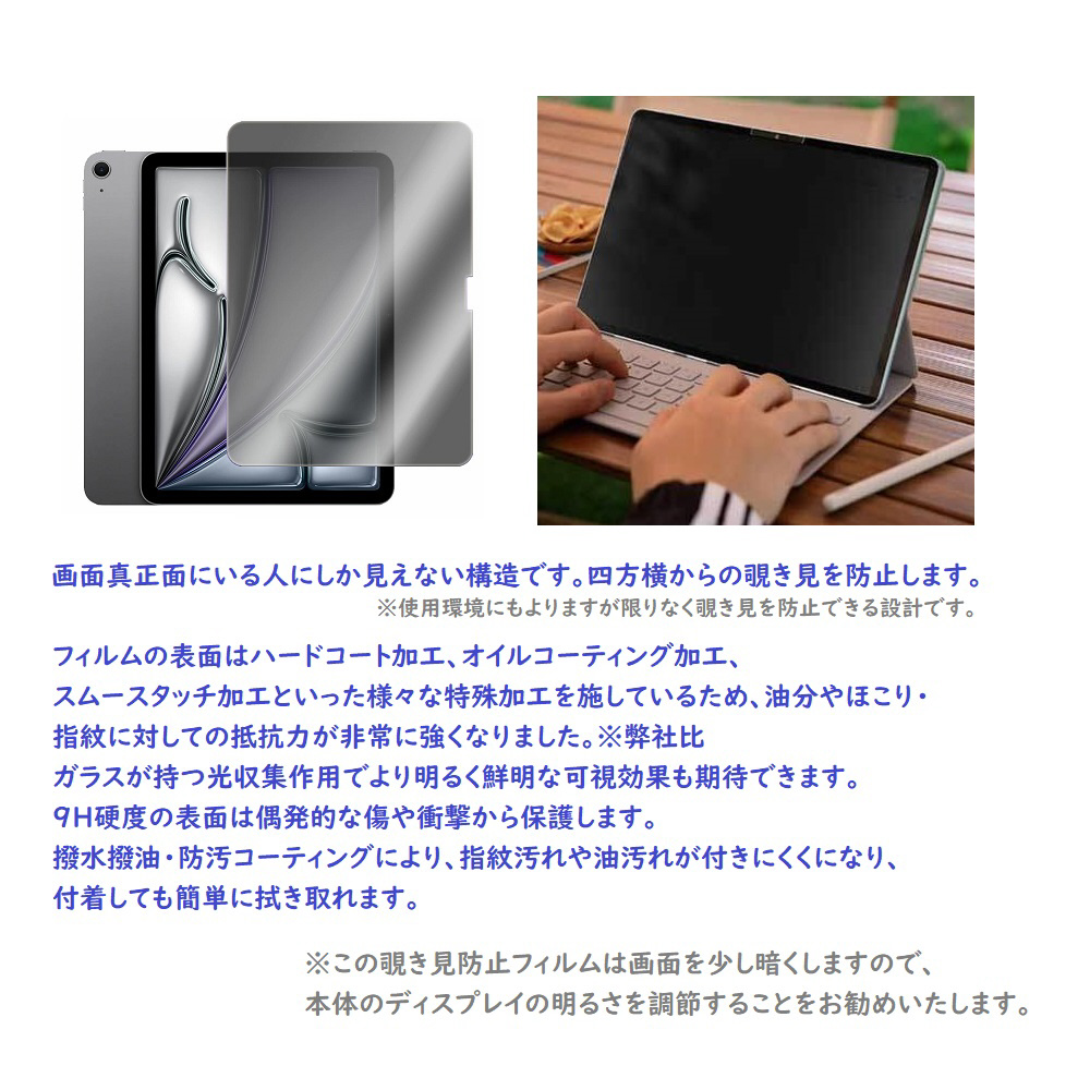 ※この覗き見防止フィルムは画面を少し暗くしますので、本体のディスプレイの明るさを調節することをお勧めいたします。