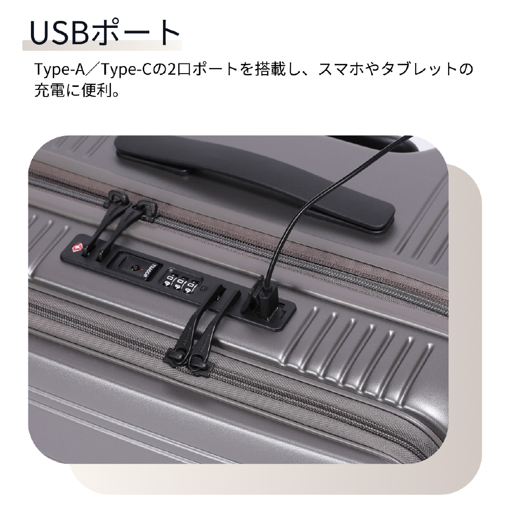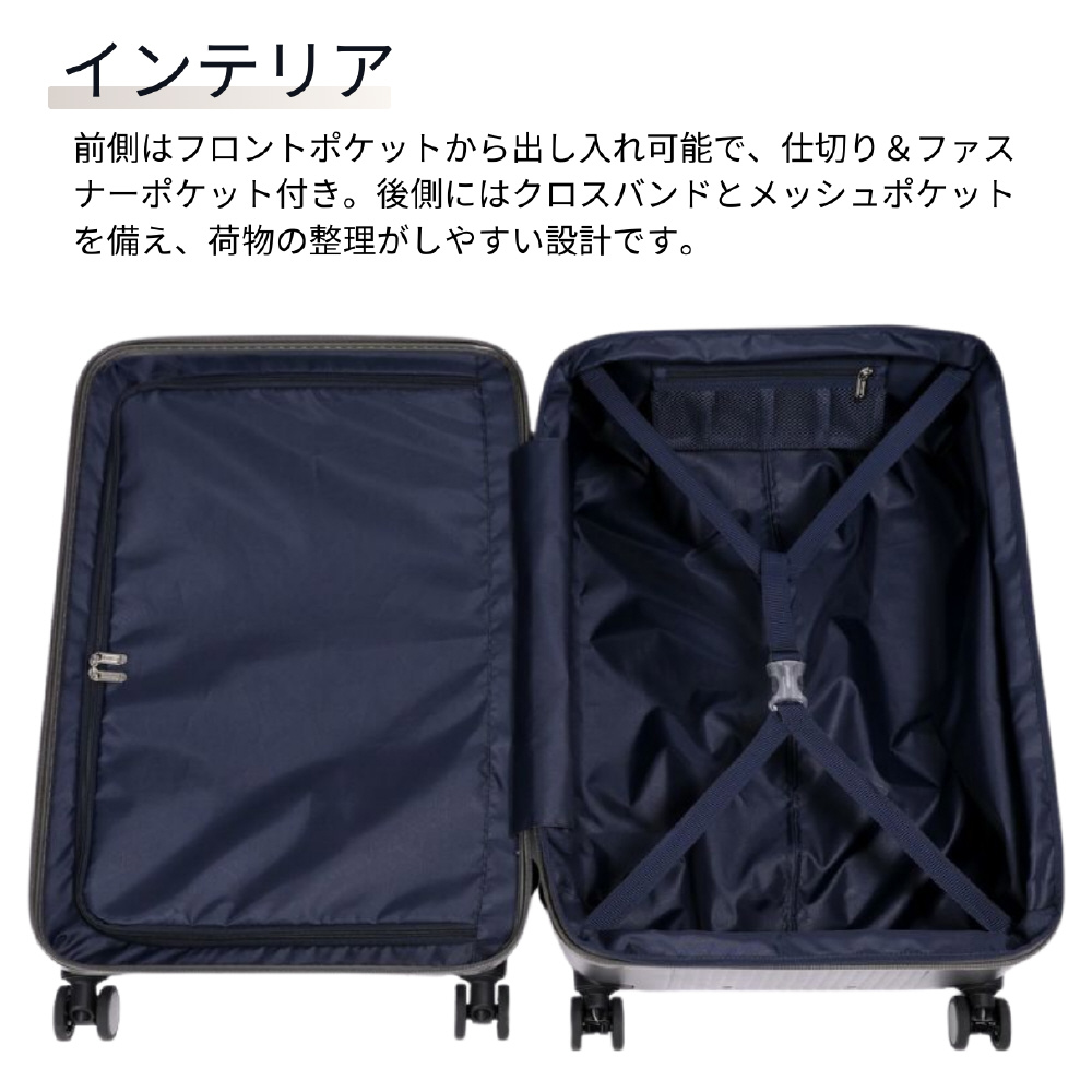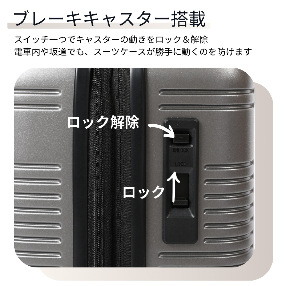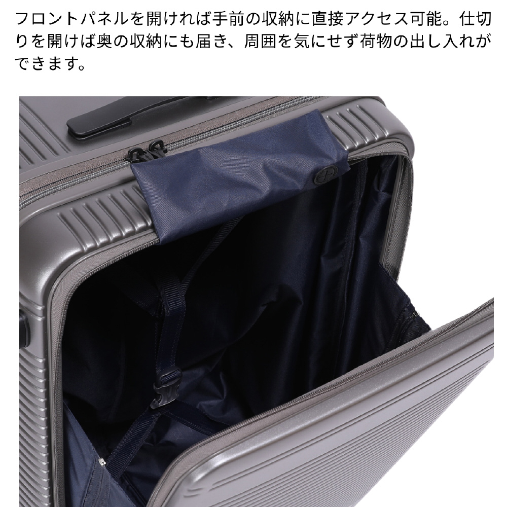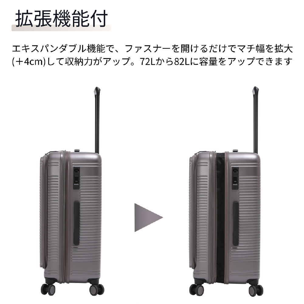 機能とデザインを両立したフロントオープンキャリー。キャスターストッパーや拡張機能など、快適な旅をサポート。