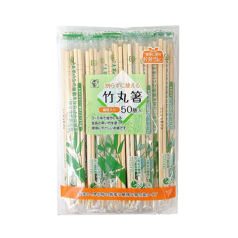 ポリ袋に個包装された竹丸箸の50膳入。個包装になっているので、衛生的です。行楽や外出時の携帯に便利です。
