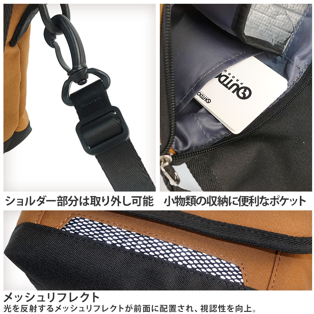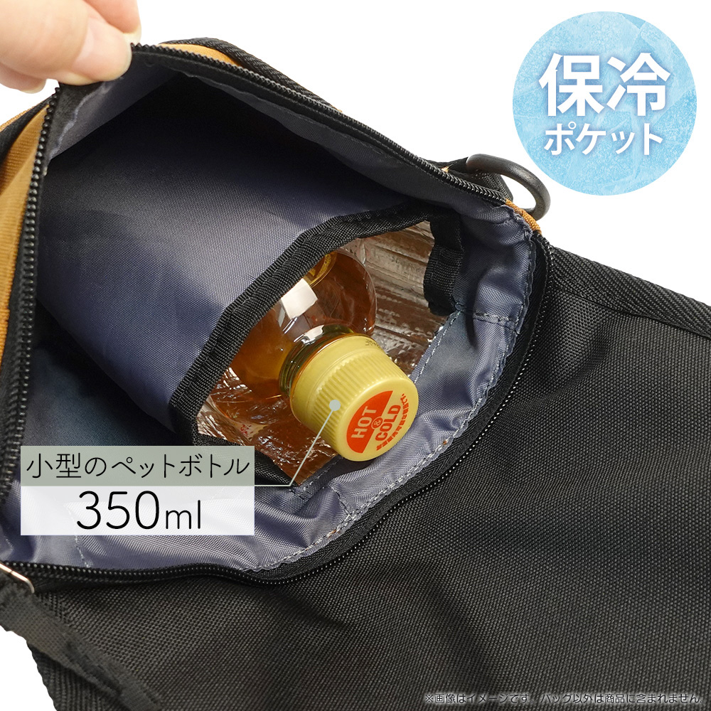 小型ペットボトルなどの飲料類を収納できる保冷ポケットを装備し、夏場の熱中症対策にも役立ちます。