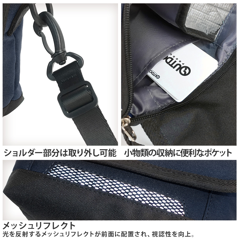 小型ペットボトルなどの飲料類を収納できる保冷ポケットを装備し、夏場の熱中症対策にも役立ちます。