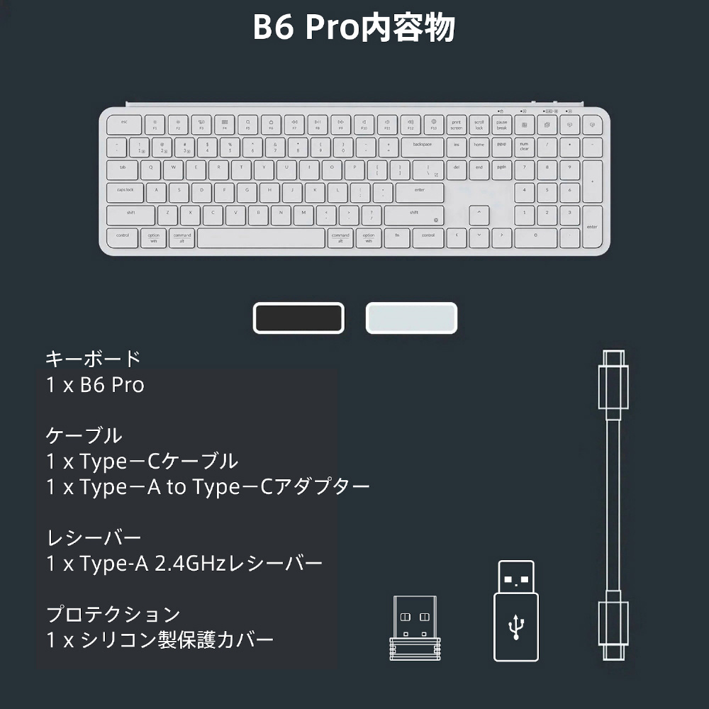 Keychron B6 Proは、シザースイッチを採用し、軽量、超薄型、フルサイズのワイヤレスキーボードで、1,200時間の長時間駆動を実現。2.4GHzワイヤレス、Bluetooth、有線モードに対応し、スマートフォン、タブレット、PC、Macに簡単に接続できます。