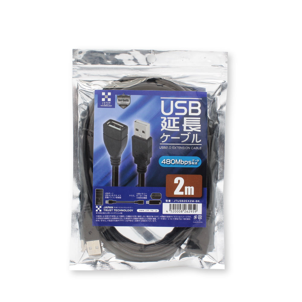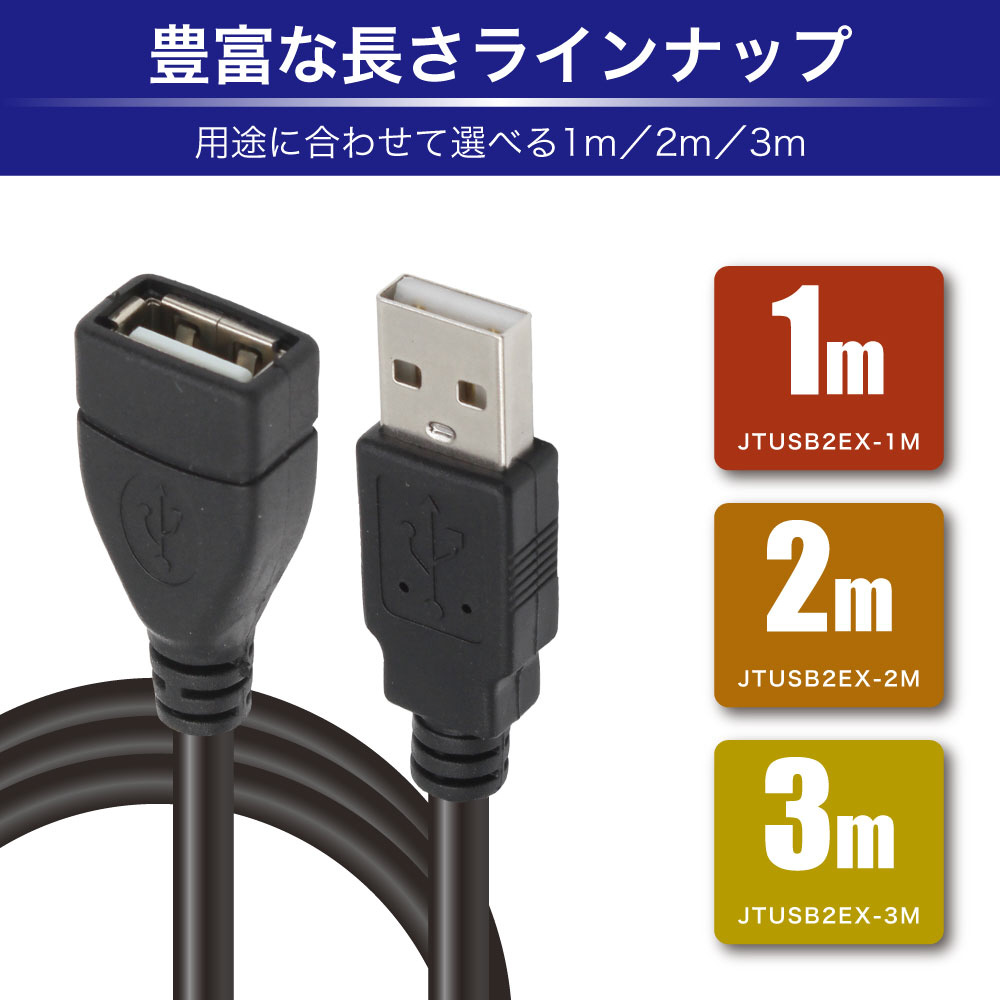 USB-A延長ケーブル [USB-A オス→メス USB-A /2m /充電 /転送 /USB2.0] ブラック JTUSB2EX2M-BK