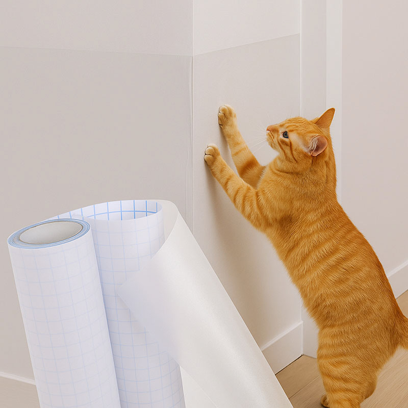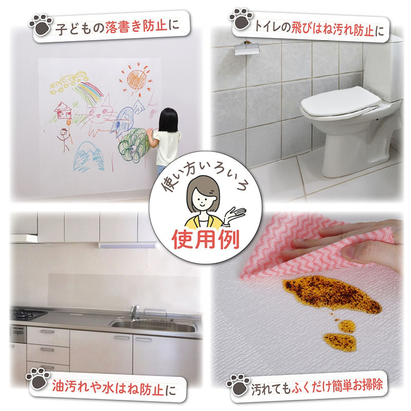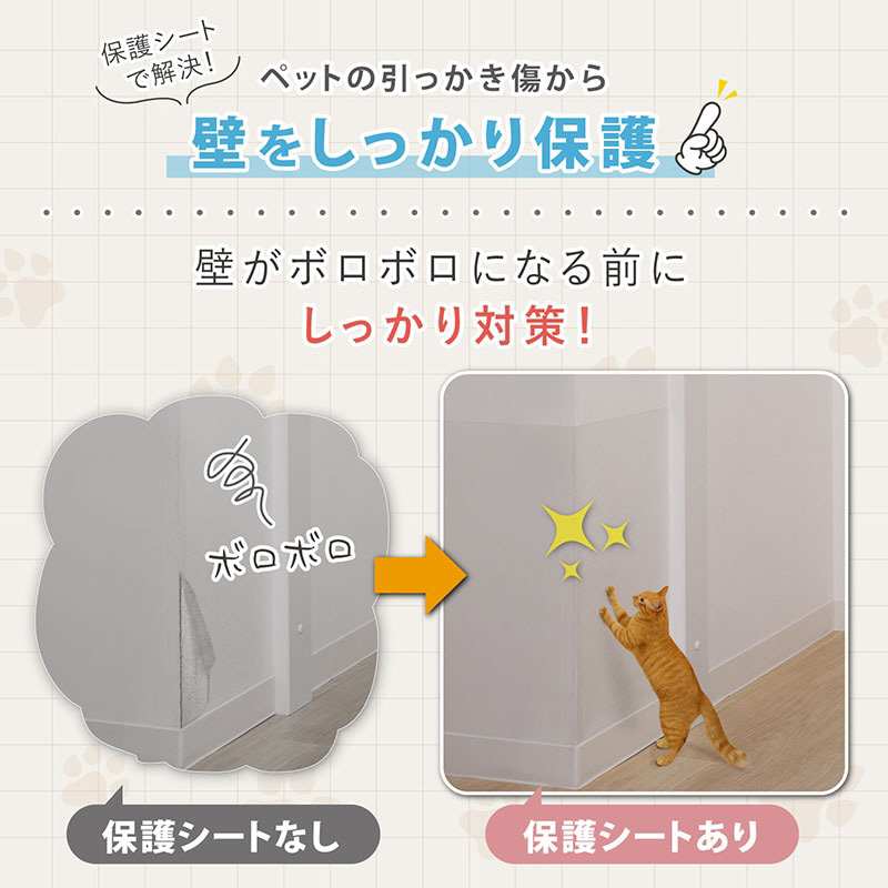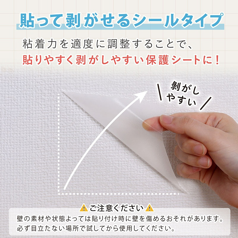 【特長】●室内の壁紙をキズや汚れなどから守るクリア(半透明)タイプの壁保護シート。●ペットのネコちゃんやワンちゃんによる爪とぎや引っかきから、壁紙を守る。●椅子やソファ、ベッドなどの家具のぶつかりによるキズやこすれからも保護。●お子様による落書きや食べ物の飛び散り防止、水はねや油はね対策などにも。●汚れてもサッと拭き取れるのでお手入れが簡単。カットしやすい方眼紙仕様。●クリア(半透明)なので壁に馴染み、お部屋の雰囲気を変えることなく使える。●適度な粘着力でしっかり密着し、剥がせるタイプなので賃貸物件でも使える。【ご注意】●凸凹の深い面やざらついた面には貼り付けできません。 サイズ: 約45×250cm内容: 1本(枚)材質: 本体/PVC、粘着剤/アクリル