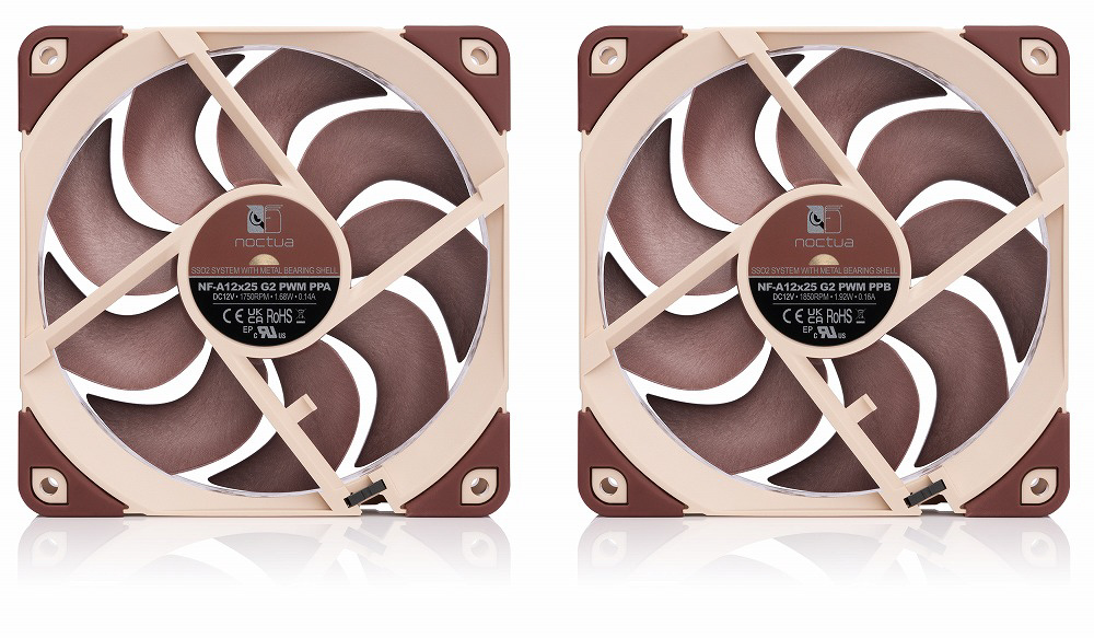 NF-A12x25 G2 PWM Sx2-PPは、速度がオフセットされた2台のNF-A12x25 G2 PWM 120mmファンのセットです。