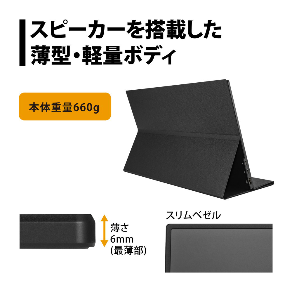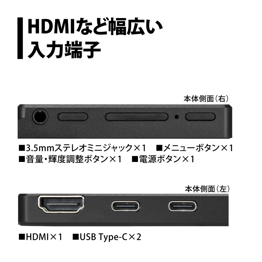 HDMIとUSB Type-C(DisplayPort Alt Mode)に対応したパソコンやスマートフォン等と簡単に接続※が出来るモバイルディスプレイです。15.6型のフルHD(1920x1080)に対応した広視野角IPSパネルを搭載し、斜めからでも鮮明な映像表示を見ることが可能です。薄型・軽量なスリムベゼル設計により携帯性に優れ、外出先やデスクサイドなど様々な場所で簡単にマルチディスプレイを実現します。