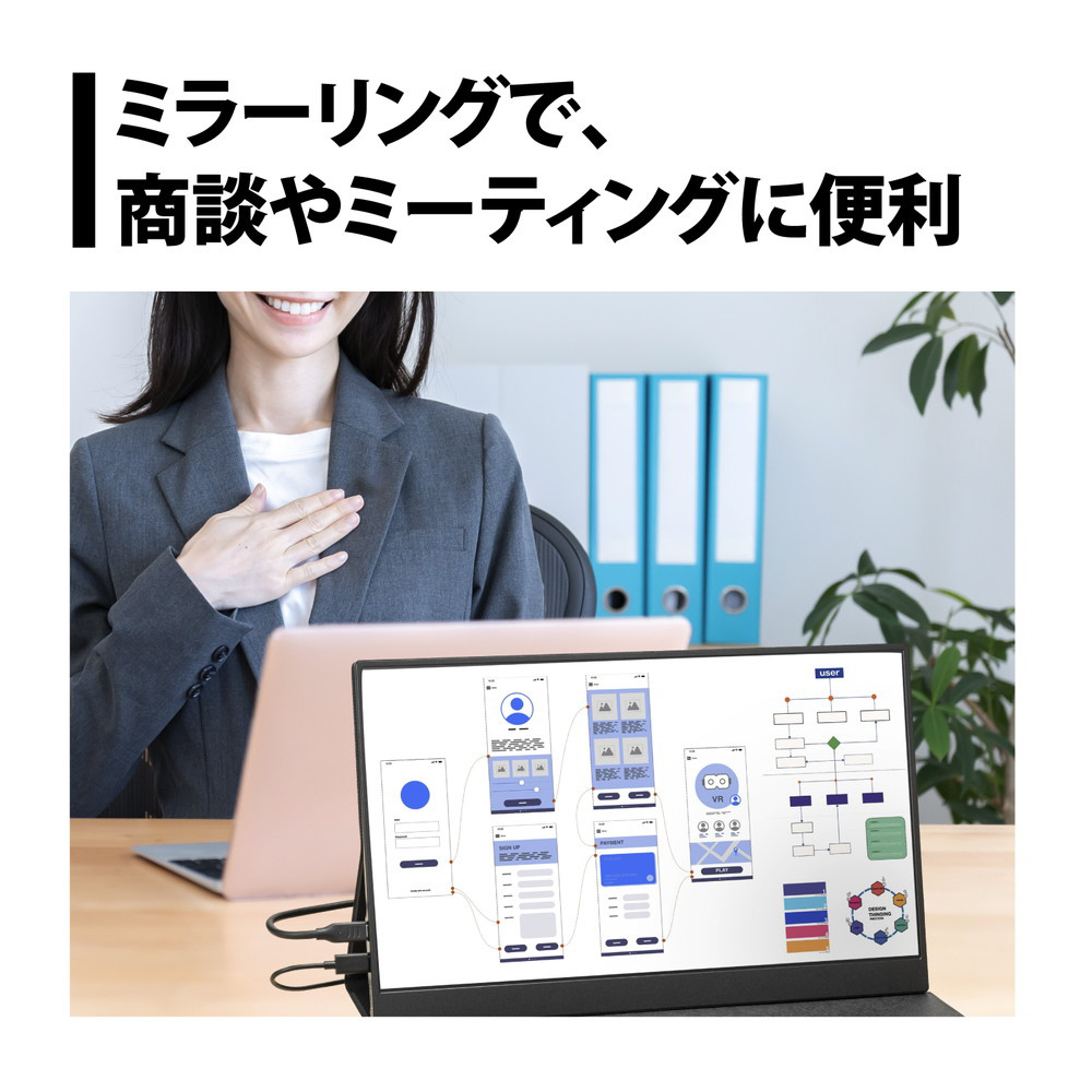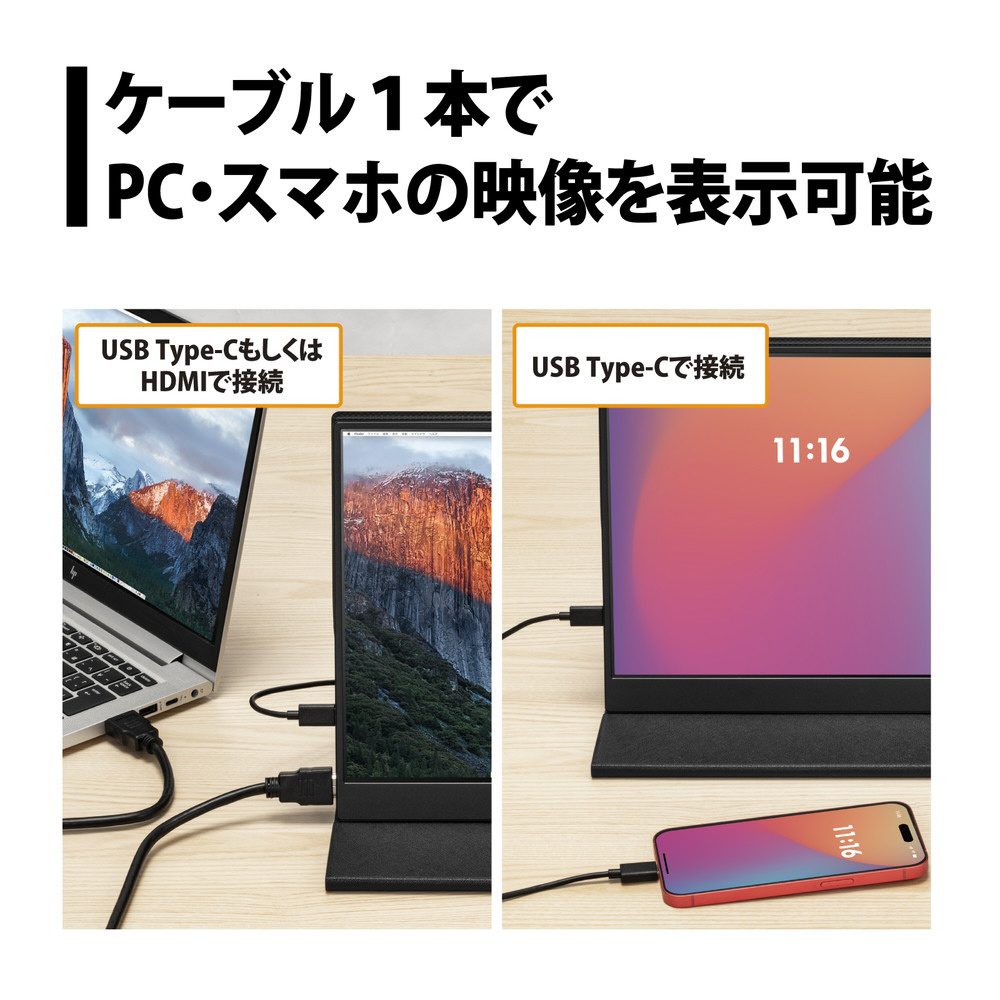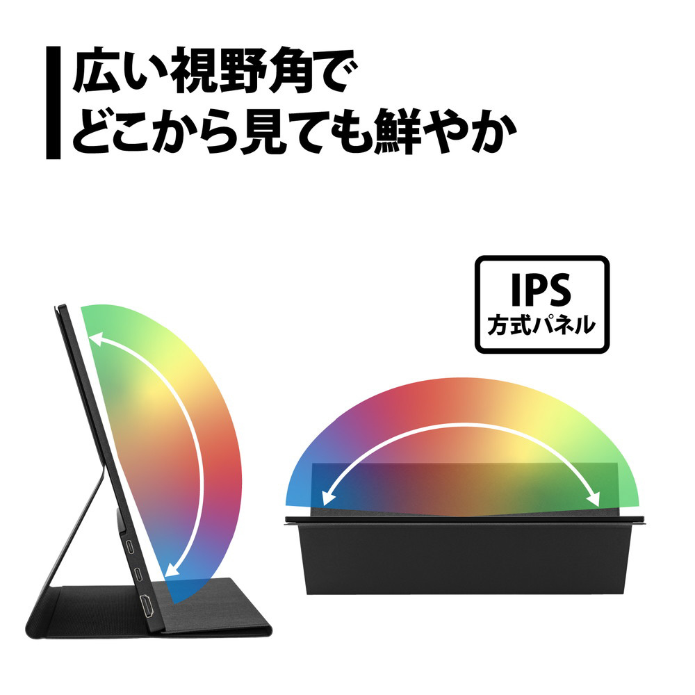HDMIとUSB Type-C(DisplayPort Alt Mode)に対応したパソコンやスマートフォン等と簡単に接続※が出来るモバイルディスプレイです。15.6型のフルHD(1920x1080)に対応した広視野角IPSパネルを搭載し、斜めからでも鮮明な映像表示を見ることが可能です。