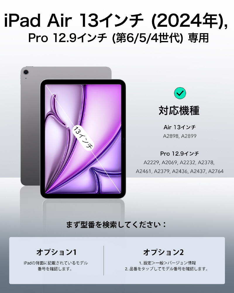 iPad Air 13インチM3(2025) M2 (2024)およびiPad Pro 12.9インチ(第6/5/4世代、2022/2021/2020)専用です。モデル: A2898、A2899、A2378、A2461、A2379、A2462、A2229、A2069、A2232、A2233、A1876、A2014、A1895、A1983。他のiPadモデルと互換性がありません。