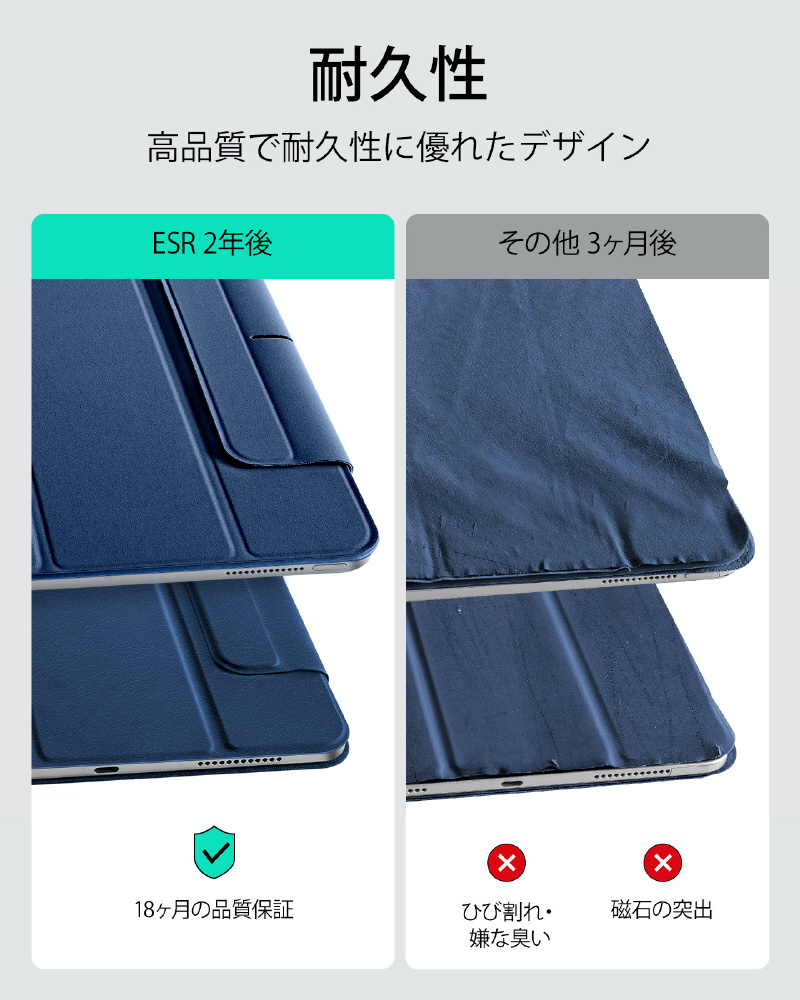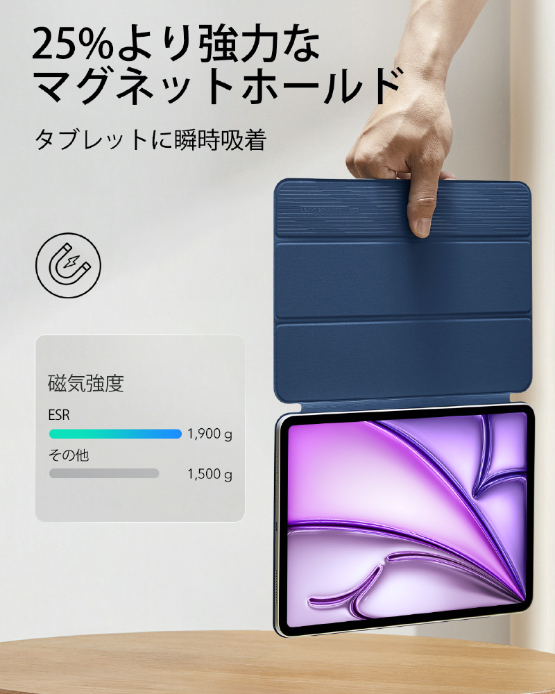 13インチiPad Air(M3/M2)、12.9インチ iPad Pro(第6/5/4世代)用 マグネットケース 三つ折りスタンド ESR Rebound Magnetic iPad Air 13 ネイビーブルー