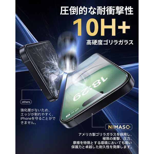 NIMASO史上最強硬度のゴリラガラスを採用。衝撃や傷の保護も史上最強の仕様となっています。高透明で画面の美しさもそのままです。