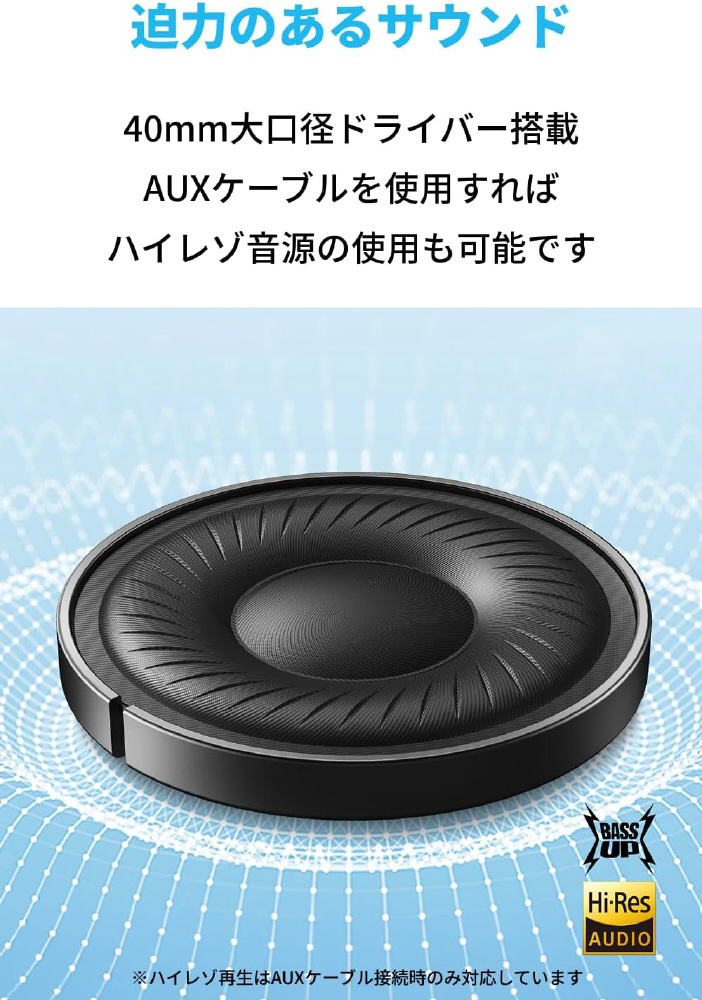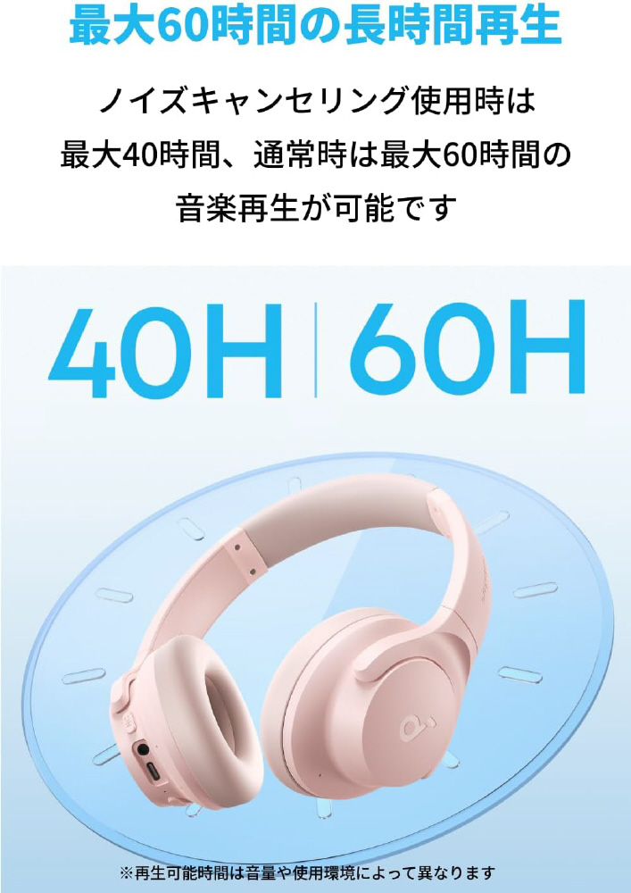 ノイズキャンセリング使用時は最大40時間、通常時は最大60時間の音楽再生が可能。5分間の充電で約4時間の音楽再生も可能です。※再生可能時間は音量や使用環境によって異なります。