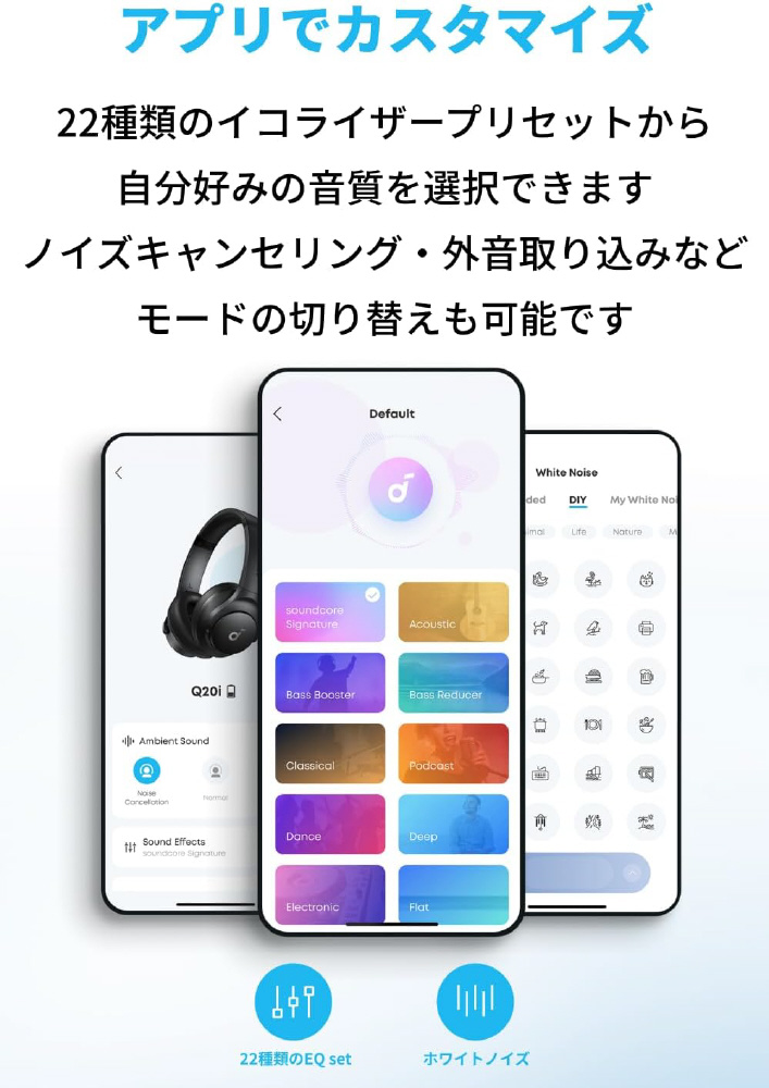 Soundcoreアプリ上で、 22種類のイコライザープリセットから自分好みの音質を選択できます。ノイズキャンセリング、標準、外音取込みなどのモードの切り替えも可能です。