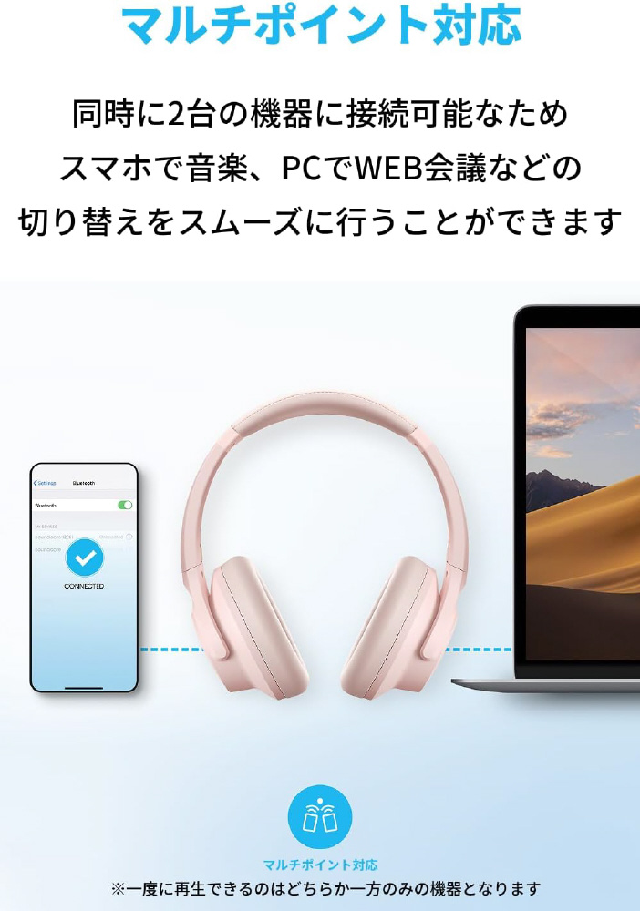 同時に2台の機器に接続可能なため、スマホで音楽、PCでWEB会議などの切り替えをスムーズに行うことができます。 ※一度に再生できるのはどちらか1台の機器のみとなります。